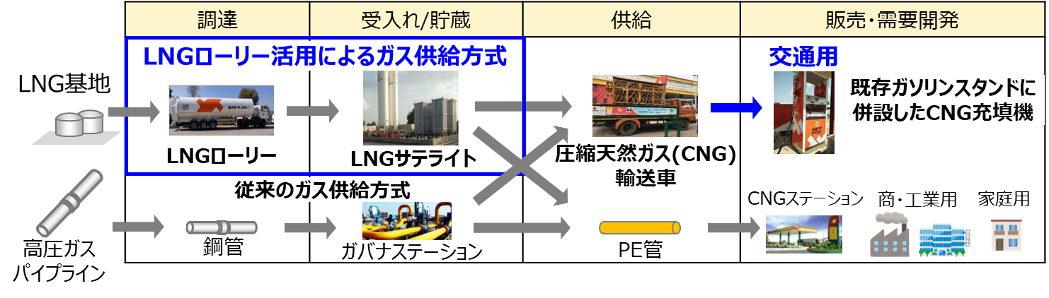本事業は、AG&P SPV3親会社および当社出資先(*3)であり、東南アジアやインドを中心にLNG事業の拡大を進めているAGP International Holdings Pte. Ltd.(以下「AGP IH」)を主体としたAG&Pグループが推進する都市ガス事業で、インド南部を中心に日本の面積の3/4に相当する広大なエリアで既に独占事業権が与えられています。インドでは初めて、主なガス供給方式としてLNGローリーを活用することで、インフラ整備期間を短縮し、CNG車向けの交通用を中心に家庭用、商業用、工業用での需要拡大を進め、将来的には、当社の国内ガス販売量(*4)の半分程度に相当する都市ガス事業の実現を目指します。