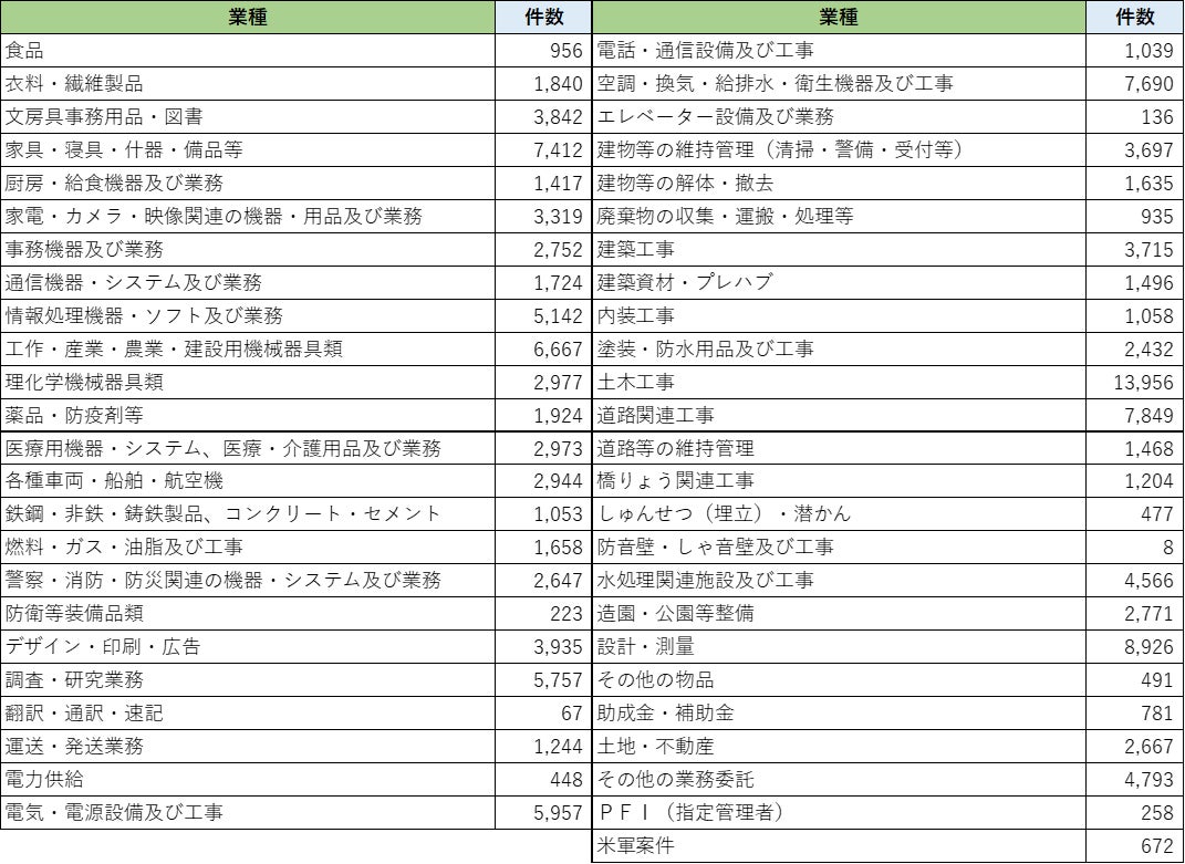 複数の業種カテゴリが1案件に付与されることがあるため、業種カテゴリの合計件数が月別の入札・公募件数にはなりません。