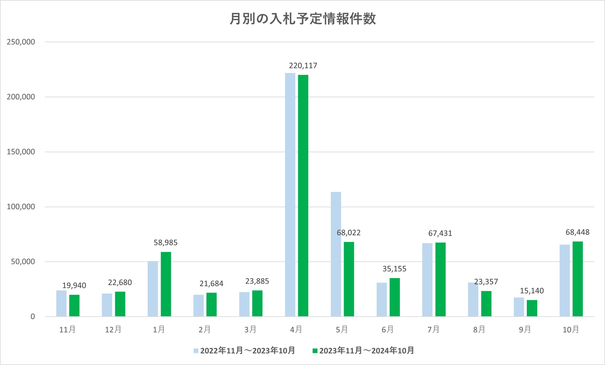 下半期のスタートとなる10月は、入札予定情報の登録件数が大きく増加しました。昨年同月と比較しても3,000件近い増加となっています。