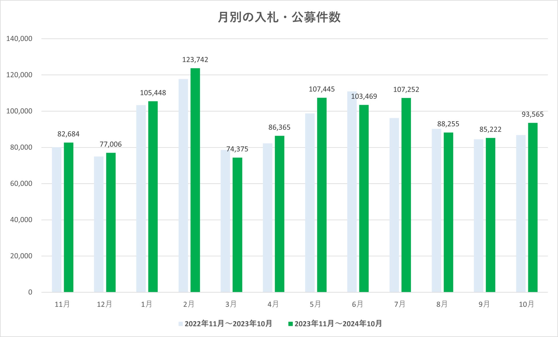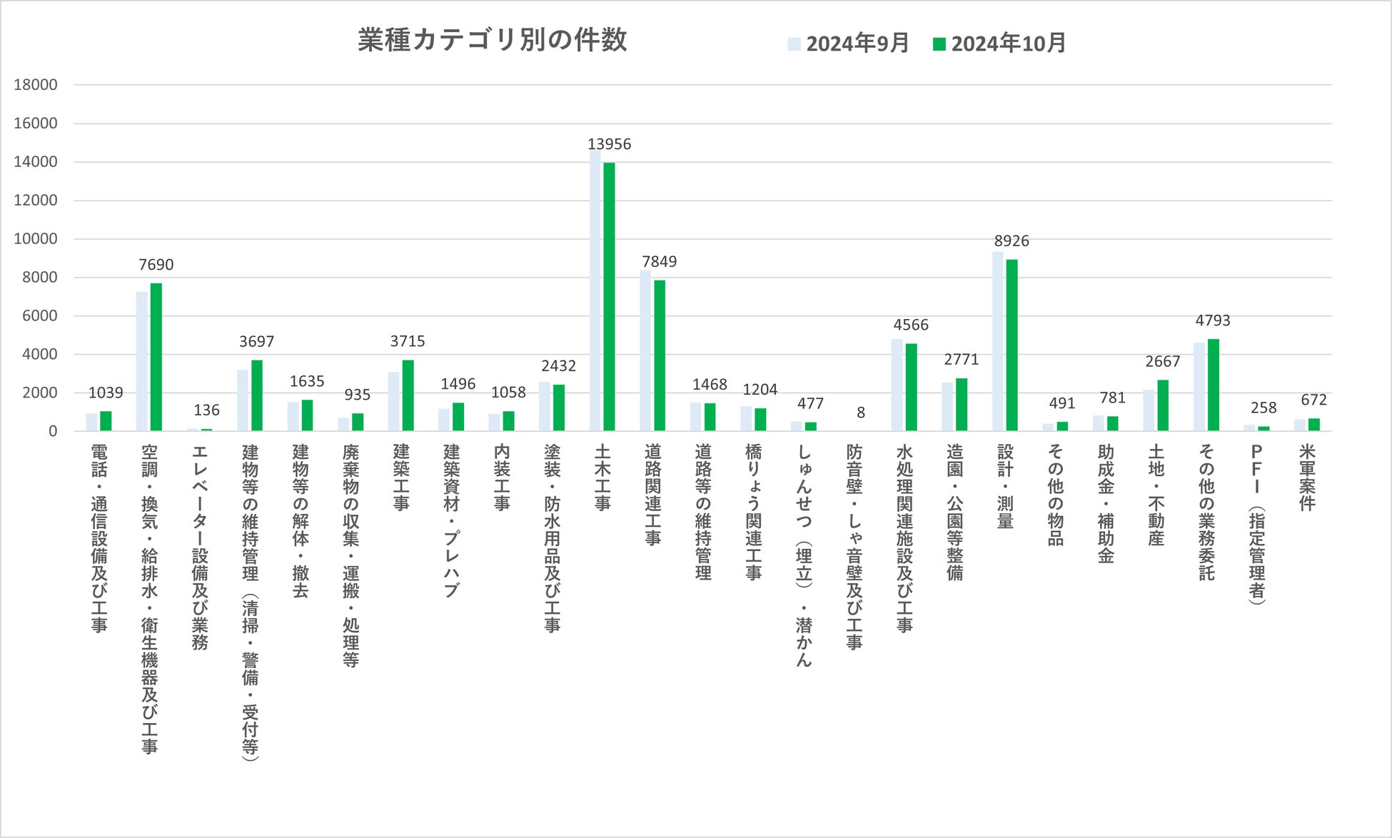 8月と9月は2か月連続で入札・公募件数が減少していましたが、10月は件数が増加に転じました。また、昨年の10月と比較しても6,750件ほどの増加になりました。