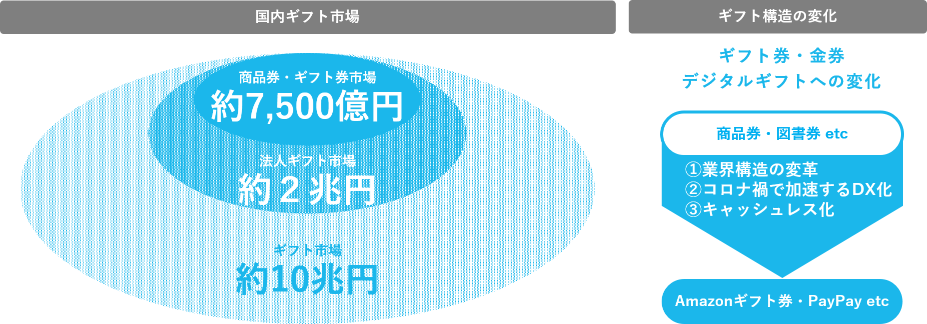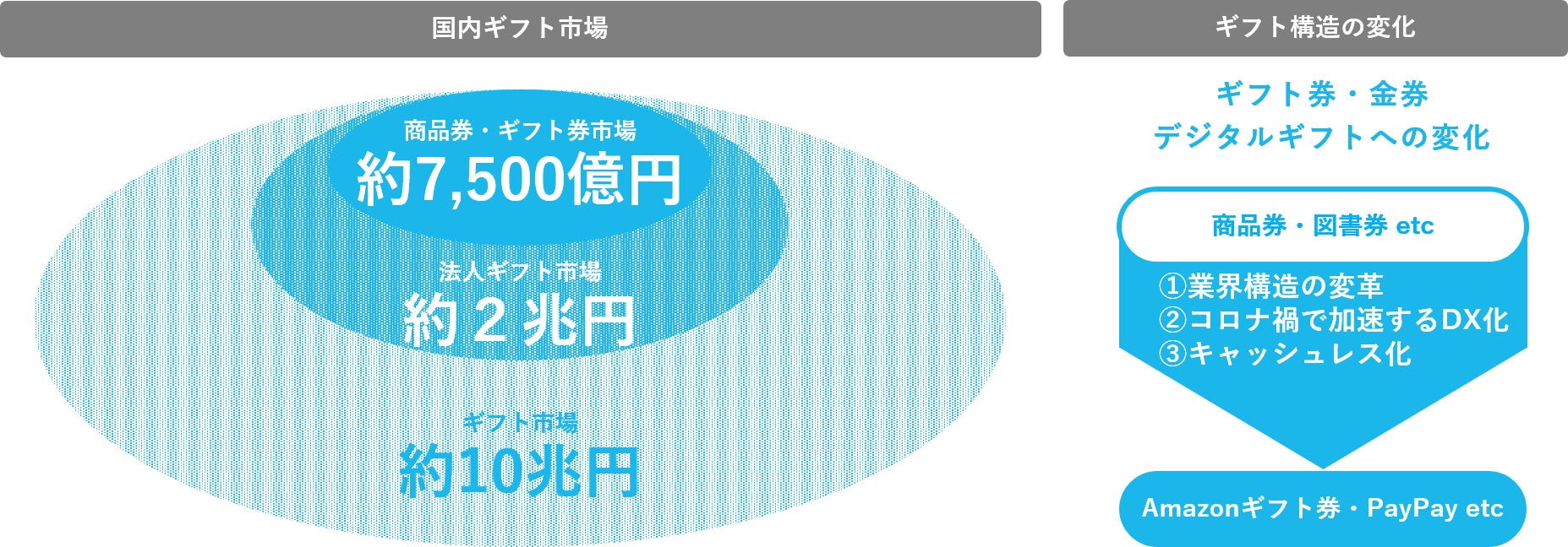従来のギフト券はもちろん、キャッシュレス化・コロナ禍によって著しく進むDX化に伴う未来のギフト・マネーサービスにも随時対応、約7500億円の金券市場を網羅していきます。