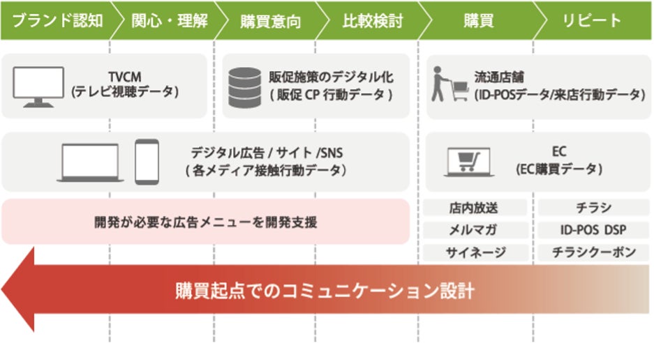 ユーザーの購買行動データを分析し、販促対象商品の離脱ユーザーや新規購買獲得など、ID-POSデータを活用したセグメント抽出とONEtoONEの広告配信が可能。また、デジタル広告配信による、リアル店舗での購買効果を分析し、広告費用対効果を可視化し、広告効果の最大化に貢献。