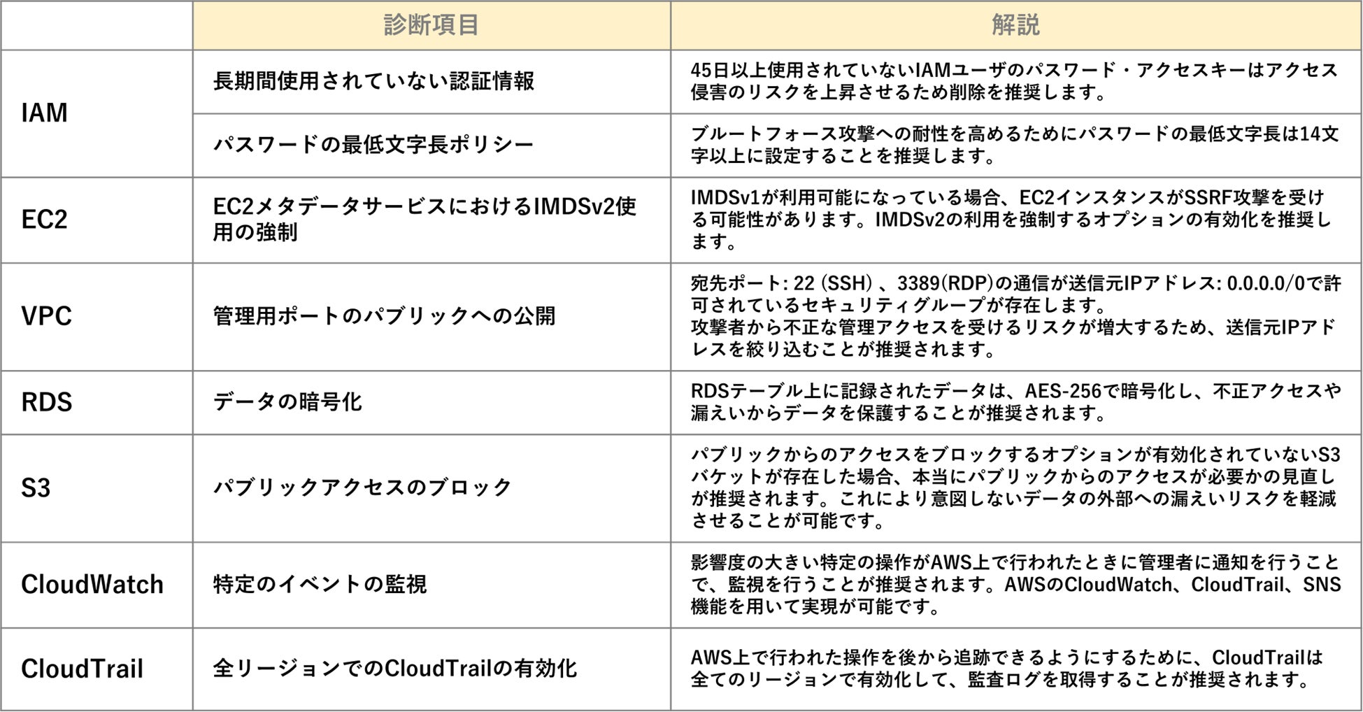 AWSセキュリティ設定診断サービスは、お客様のAWS環境がセキュリティ面で適切な設定がされているか診断するサービスです。本サービスでは、お客様のAWS環境の設定情報を、APIを通じて取得し、CIS Amazon Web Services Foundations Benchmarkに基づいて適合性を検査します。このサービスを利用することで、AWSの重大なインシデントを未然に防ぐことができます。