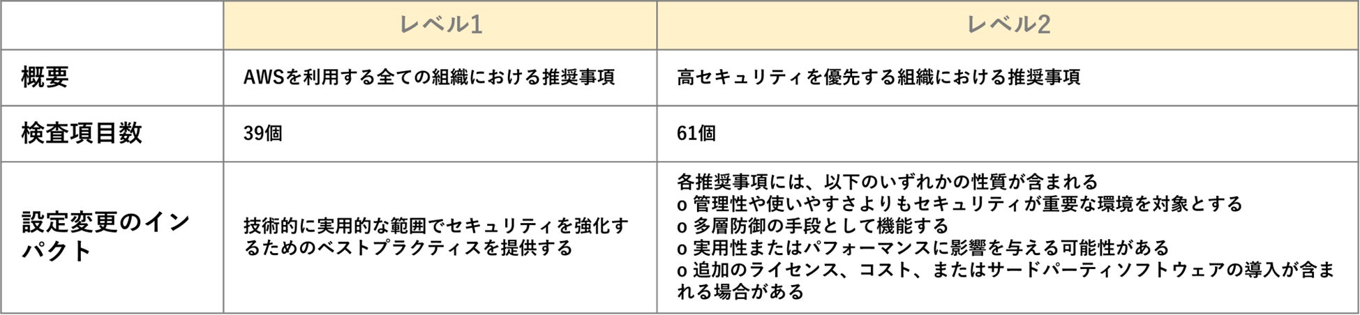 各検査項目は組織が目標とするセキュリティレベルに応じて、レベル1とレベル2に分かれております。