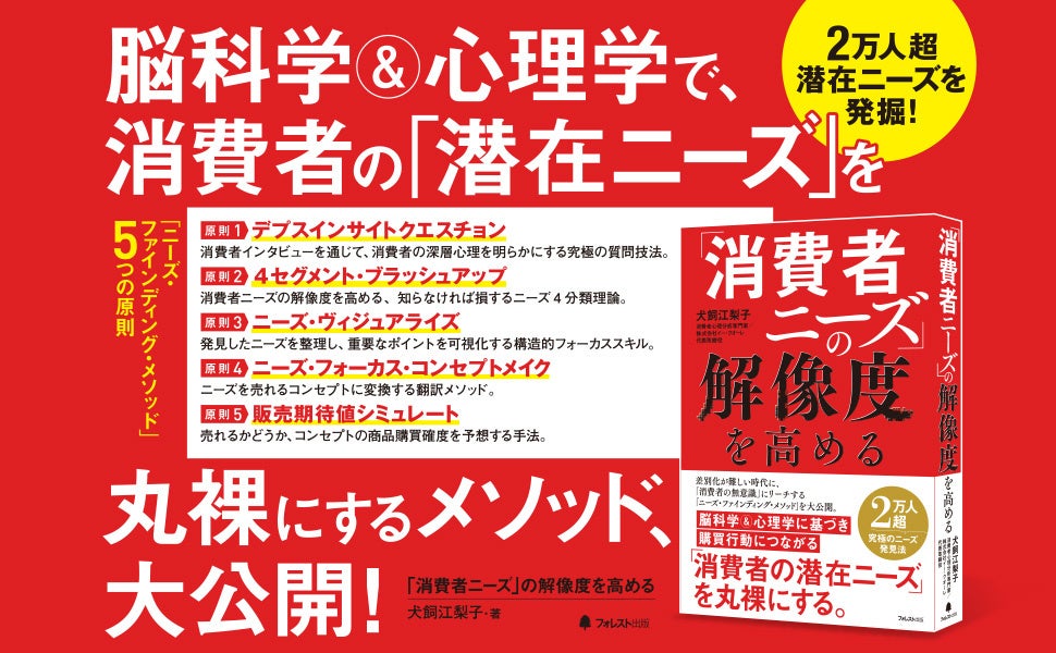 フォレスト出版株式会社(所在地:東京都新宿区、代表取締役:太田 宏)は、新刊『「消費者ニーズ」の解像度を高める』(犬飼江梨子 著)を2024年11月10日(日)以降順次発売いたします。本書は、脳科学と心理学を用いて消費者の潜在ニーズにリーチし、マーケティングや商品戦略に応用する新しい手法「ニーズ・ファインディング・メソッド」を紹介。差別化が困難な現代の市場で、消費者の無意識に隠れた「本当のニーズ」を解き明かし、売れるコンセプトづくりの秘訣を解説しています。