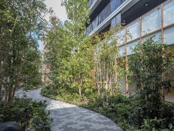 ・建物西側のアプローチ・遊歩道、東面の中庭、北側の植栽帯には、多数の中高木、低木、地被類を植樹することで、地表面や近傍の温度上昇の抑制に配慮した。さらに、木陰を形成することで、通行人への納涼効果に期待する計画とした。(緑地/空地=25.4%)
