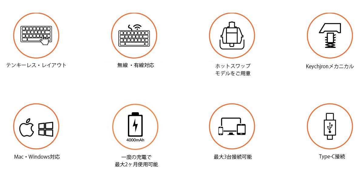 Keychron K8は、最も人気のあるテンキーレス・レイアウトで、生産性を最大限高めることができるように設計されています。メカニカルスイッチは、ホットスワップモデルもご用意しており、ハンダ付けすることなく、簡単にカスタマイズすることができます。一度の充電で最大2ヶ月もの使用が可能です。