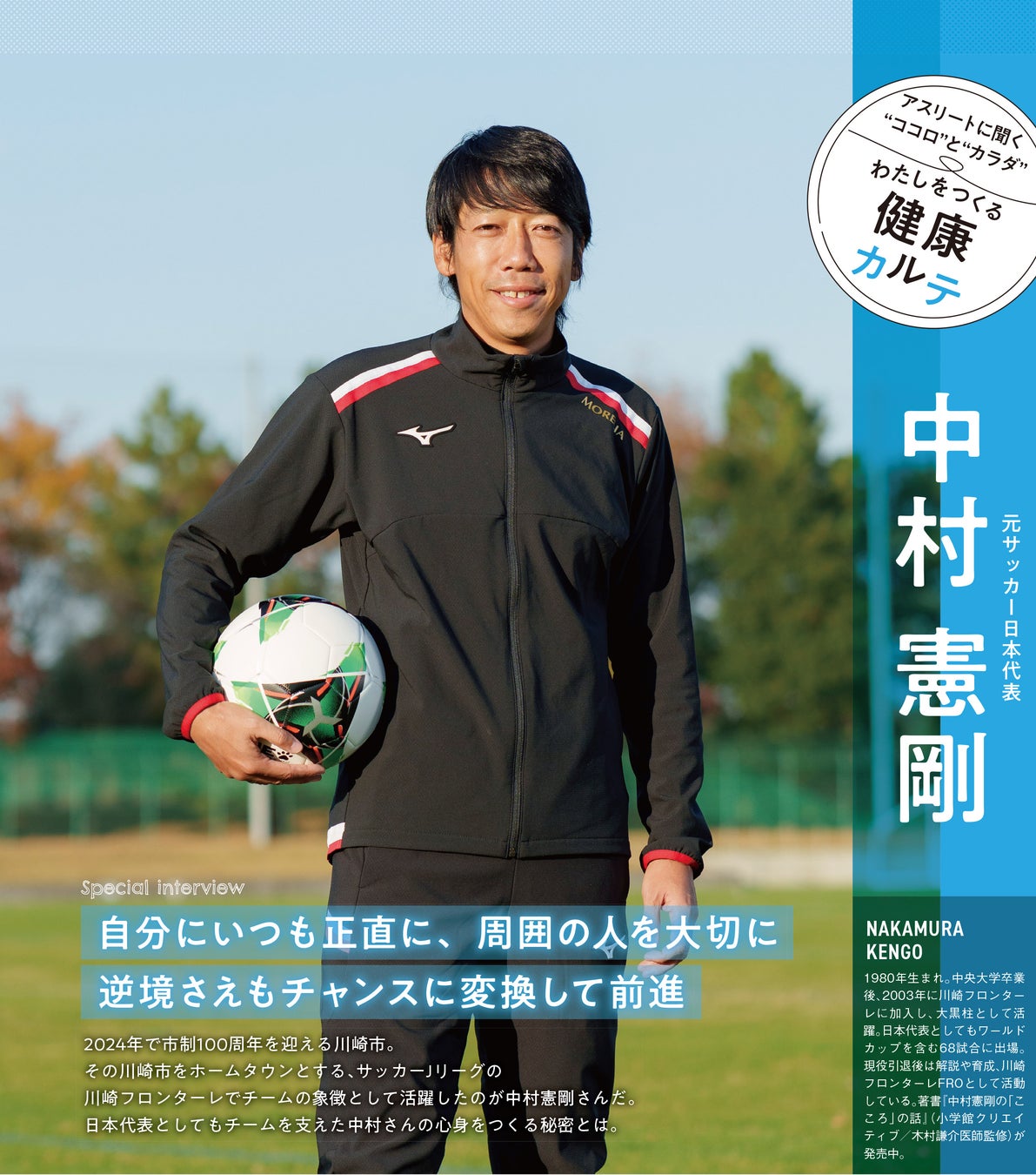 「頼れるドクター」では、健康が自身のパフォーマンスに大きく関わるアスリートの方々に、心身の体づくりの秘訣や健康管理に欠かせない「かかりつけ医」との付き合い方などを伺う、「アスリートに聞く“ココロ”と“カラダ” わたしをつくる健康カルテ」を不定期で掲載しています。今回は、サッカー日本代表や川崎フロンターレで司令塔として活躍し、現在は川崎フロンターレのFrontale Relations Organizer(FRO)として活動する中村憲剛さんにお話を伺いました。