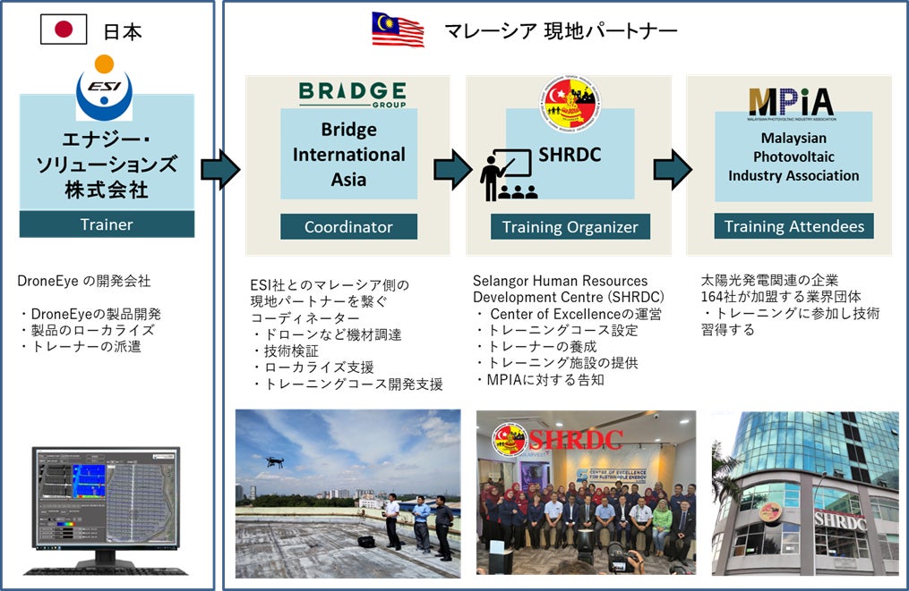 また、SHRDCは同日、ブリッジインターナショナルアジアの協力のもとでCenter of Excellence Sustainable Energy を開設いたしました。ブリッジインターナショナルアジアのパートナーであるエナジー・ソリューションズ株式会社が開発した「ドローンアイ」サービスをマレーシアでも展開し、太陽光発電所の管理運用の高度化を実現するため、同日よりCenter of Excellence Sustainable Energyではサービスの展示および技術トレーニングの提供を開始いたしました。