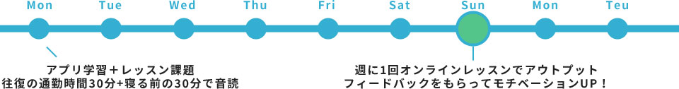 1週間の学習イメージとしては、毎日アプリ自主学習とレッスン課題を行い、週に1回のオンラインレッスンでアウトプットを行います。Teacherから適切なフィードバックをいただけるので、次週の学習に活用してください。