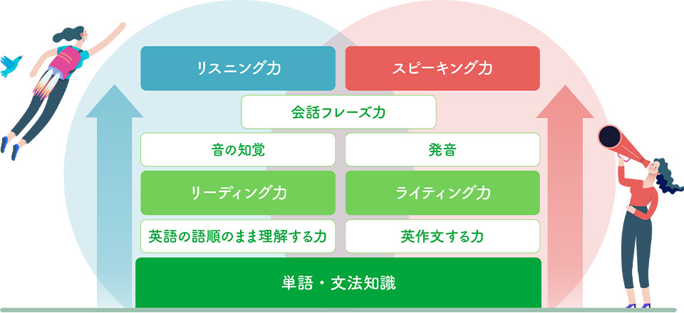 Teacher とのオンランレッスンとAI搭載の最先端アプリがあなたの英語学習を効率化して、最短で使える英語が身に付く新しいオンライン英会話です。英語の6技能を中心とした各スキルは密接に関連していますので、どれか一つのスキルを鍛えるのではなく、総合的に鍛えることが結果的にリスニング力やスピーキング力アップに繋がります。科学的に証明された日本人に必要なトレーニングレシピで英語学習をはじめましょう。