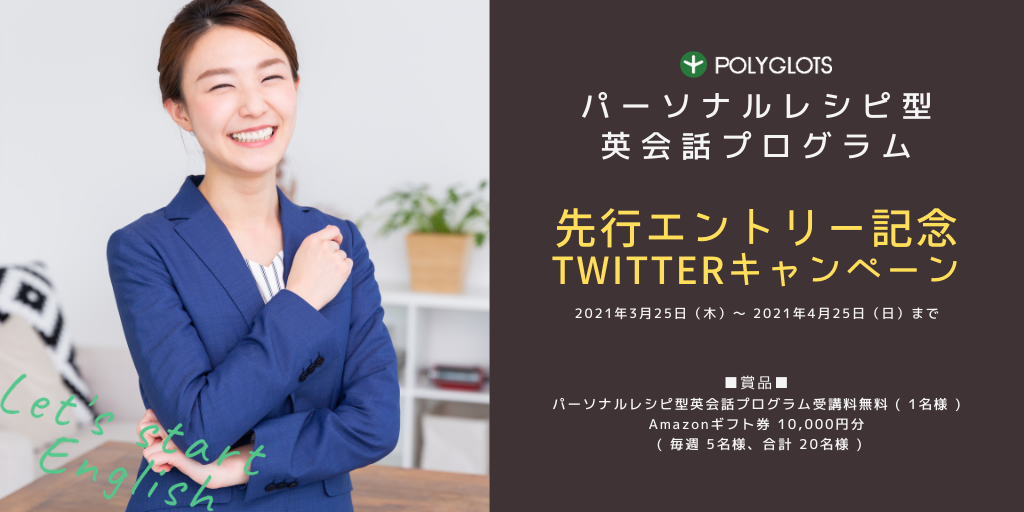 株式会社ポリグロッツ(本社:東京都新宿区、代表取締役:山口隼也)は、2021年4月26日受付開始の新サービス『パーソナルレシピ型英会話プログラム』の先行エントリーキャンペーンを開始しました。エントリーをいただいた方の中から抽選で1名様にプラン無料受講、全員に受講料10%OFFにてご提供させていただきます。また、受付開始まで毎週5名の方にAmazonギフト10,000円分が当たる「先行エントリー記念Twitterキャンペーン」も同時開催します。