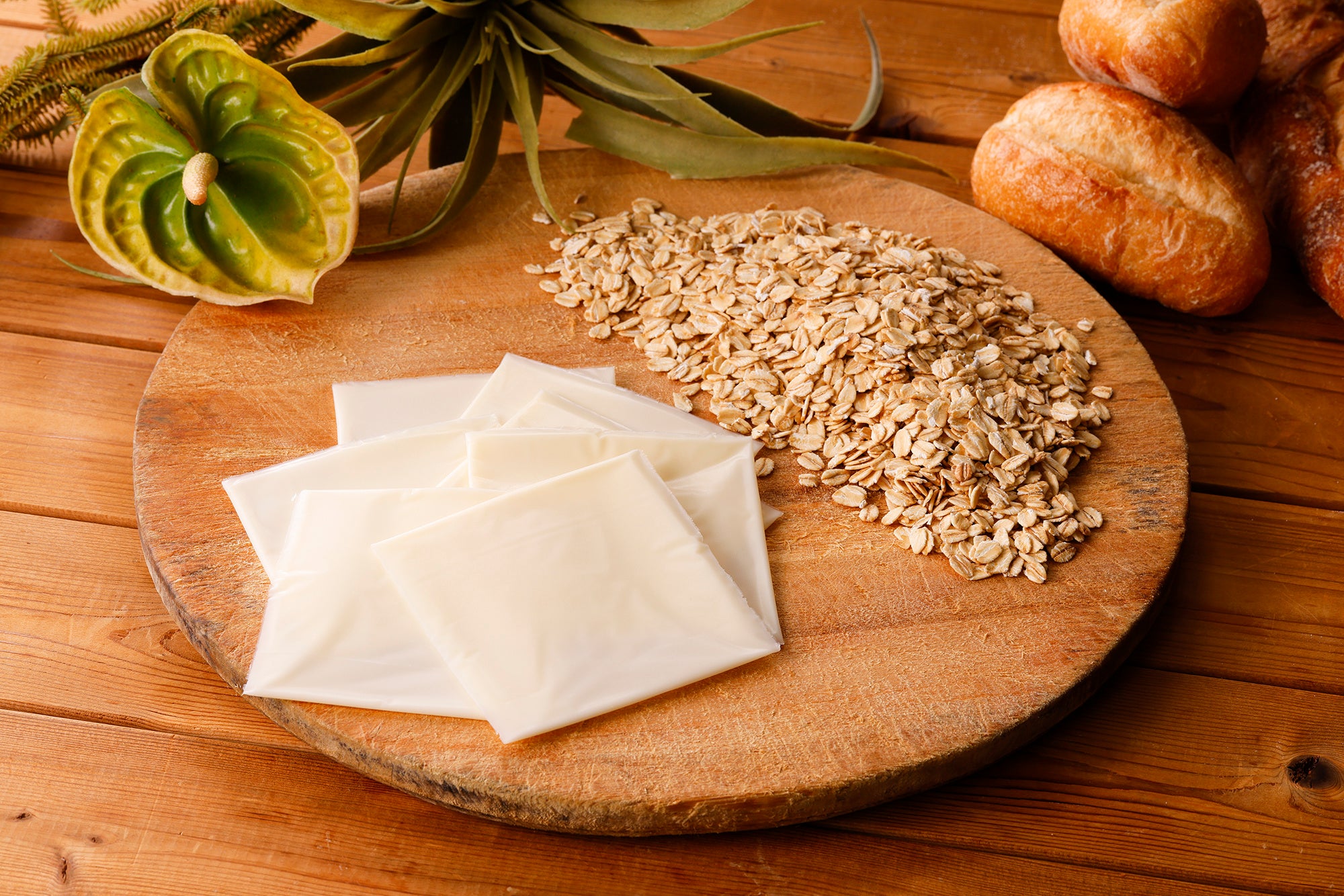 「オーツミルクを使ったとろける植物スライス105g/180g」は、おいしいチーズ料理をより健康的に楽しんでいただくために、植物由来の原料をベースに作ったチーズ代替品で、第3のミルクとして注目されているオーツミルクを使用いたしました。
