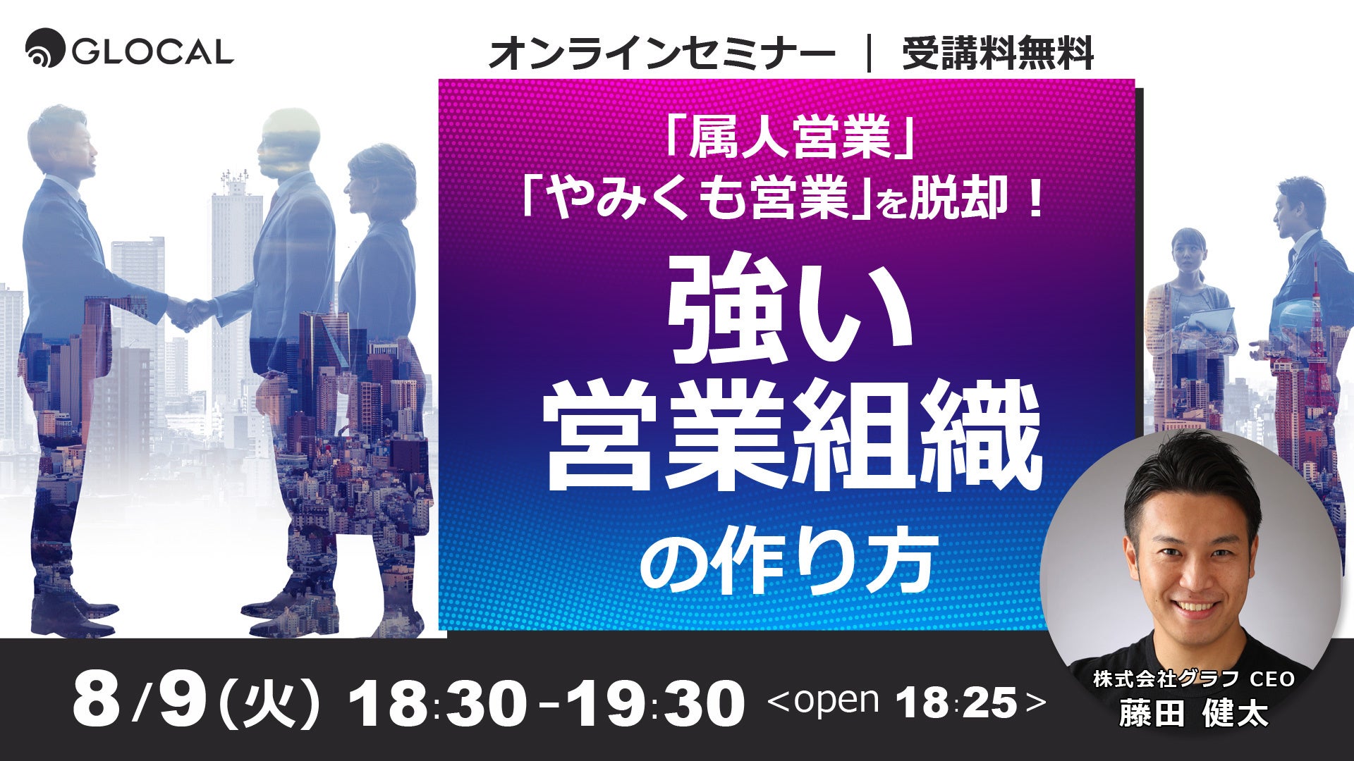 地域の中小・中核企業を対象に経営コンサルティング事業を行う株式会社グローカル(東京都渋谷区、以下グローカル)は、中小企業の経営者・営業責任者を対象に、目標を達成する強い営業組織の作り方を解説する無料オンラインセミナーを、2022年8月9日(火)18:30から開催します。今回は、スタートアップから大企業まで営業組織改革のコンサルティングを行う株式会社グラフの藤田健太氏をお招きし、具体的な事例を交えながらお話しいたします。