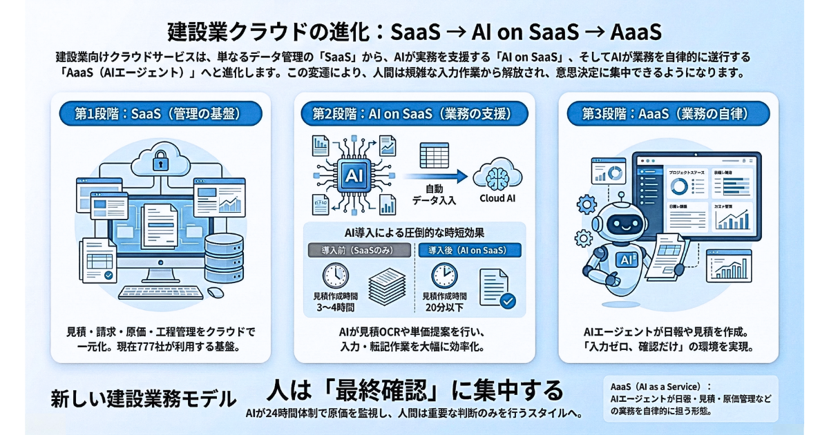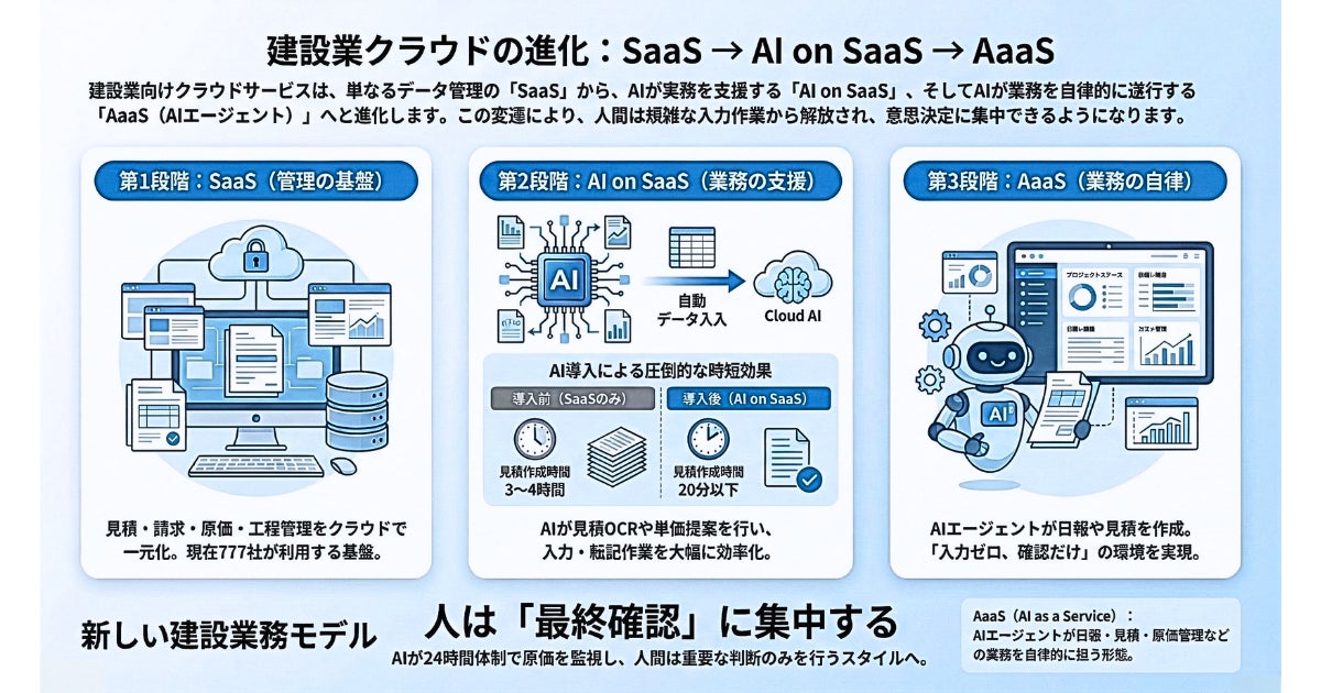 建設業のDXを推進し、AI活用による業務変革(AX:AIトランスフォーメーション)を支援する株式会社CONOC(本社:東京都渋谷区、代表取締役:山口 一、以下:CONOC)は、建設業向けクラウドサービス「CONOC建設業クラウド」のプロダクト進化構想として、従来のSaaS(Software as a Service)から、AI on SaaS、そしてAaaS(Agent as a Service)へと進化する3段階ロードマップを発表いたします。