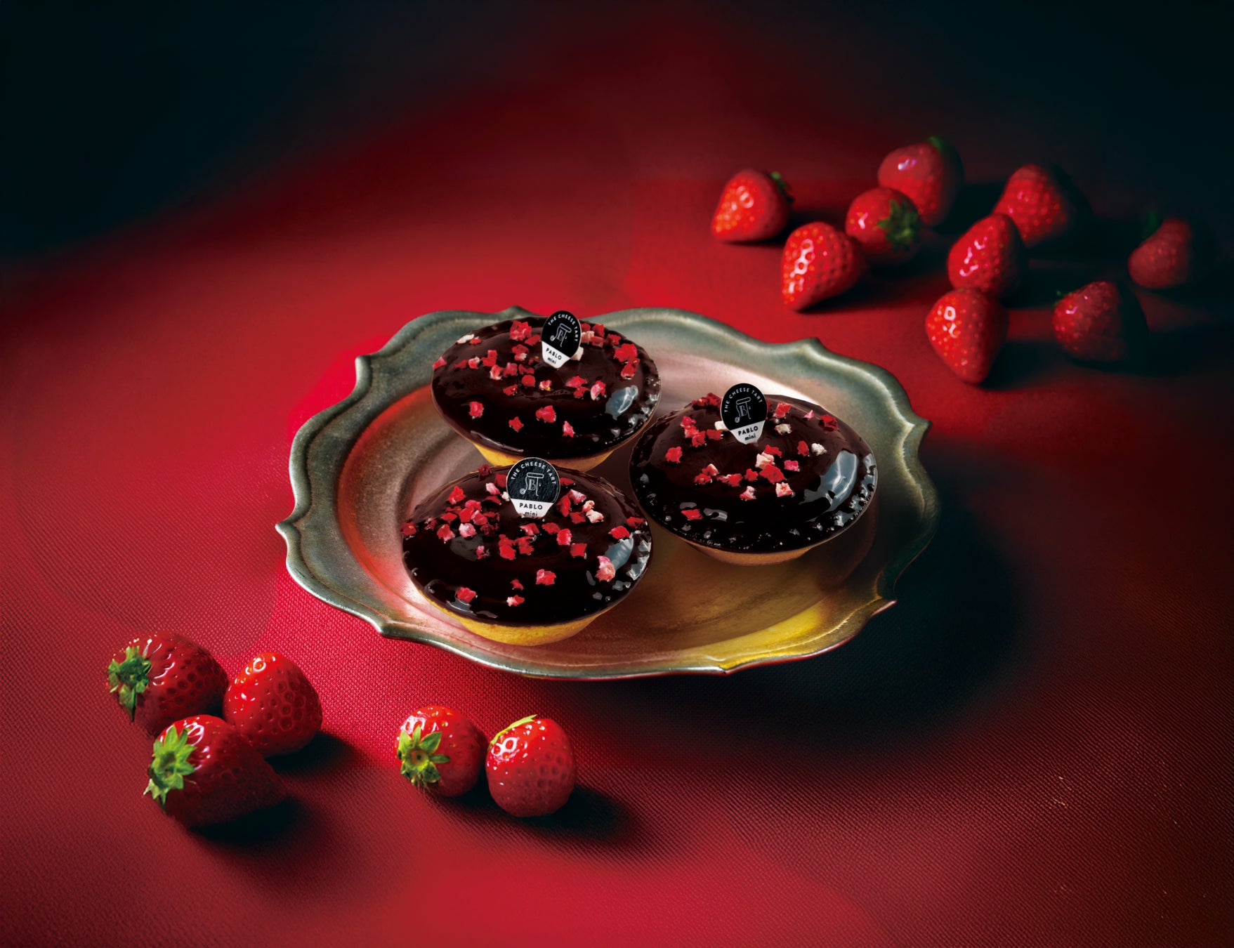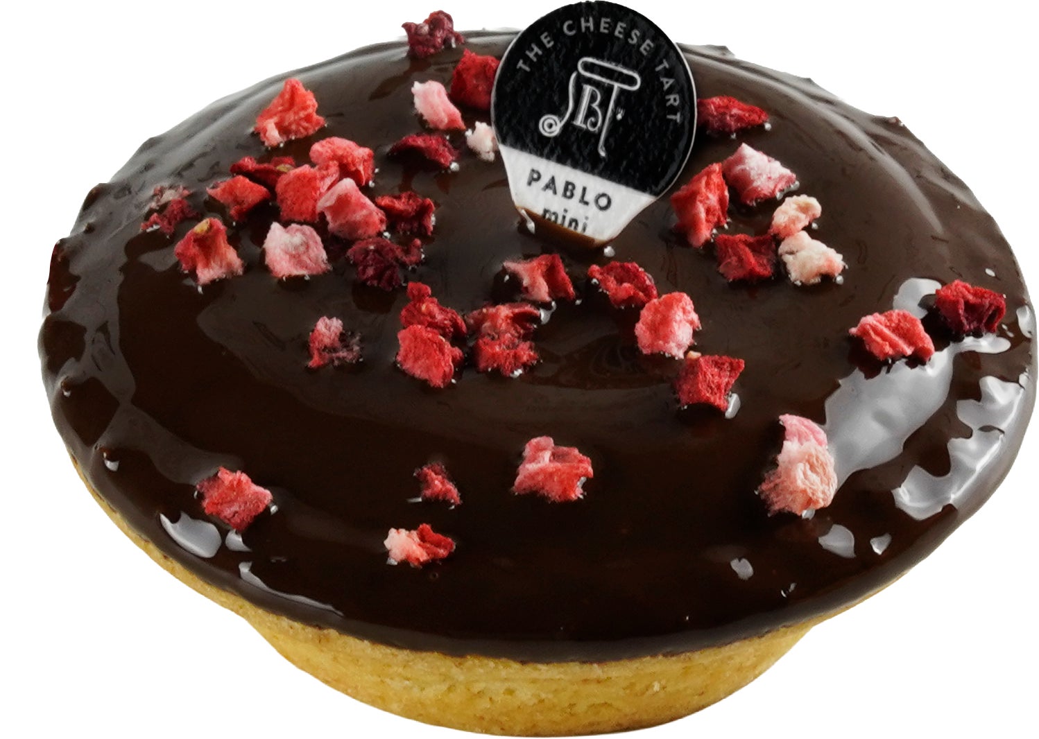 サクサクのタルト生地にチーズクリームを流しこみ、こんがりと焼き上げました。 その表面を、ほろ苦く香り高いビタースイートチョコレートでコーティングし、甘酸っぱいフリーズドライのストロベリーピースをあしらいました。