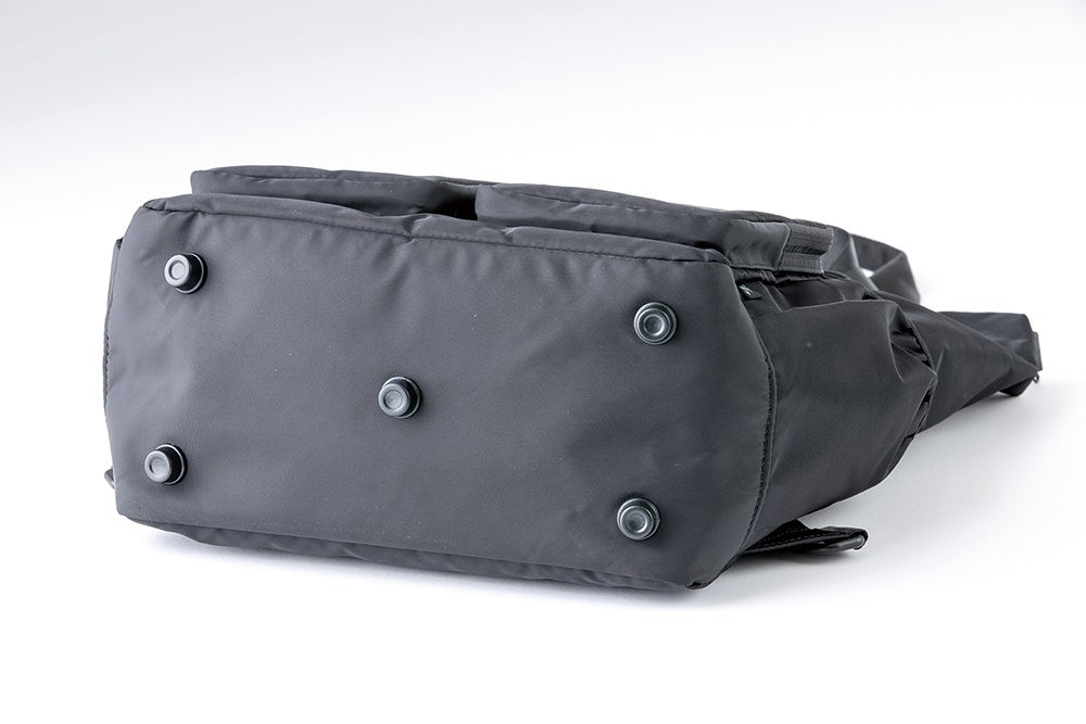 →「底鋲(そこびょう)」を5つ設置。カバンの底が地面に直接つかないため、汚れにくい仕様。