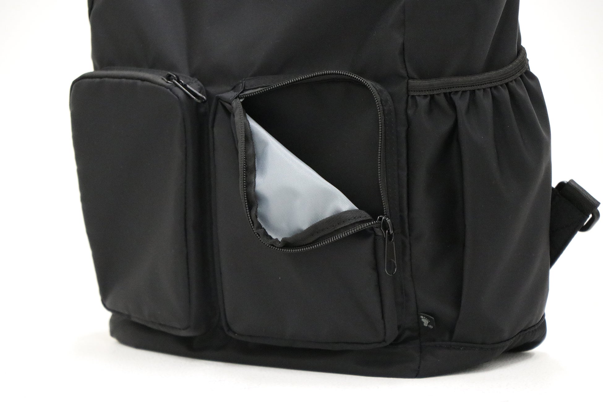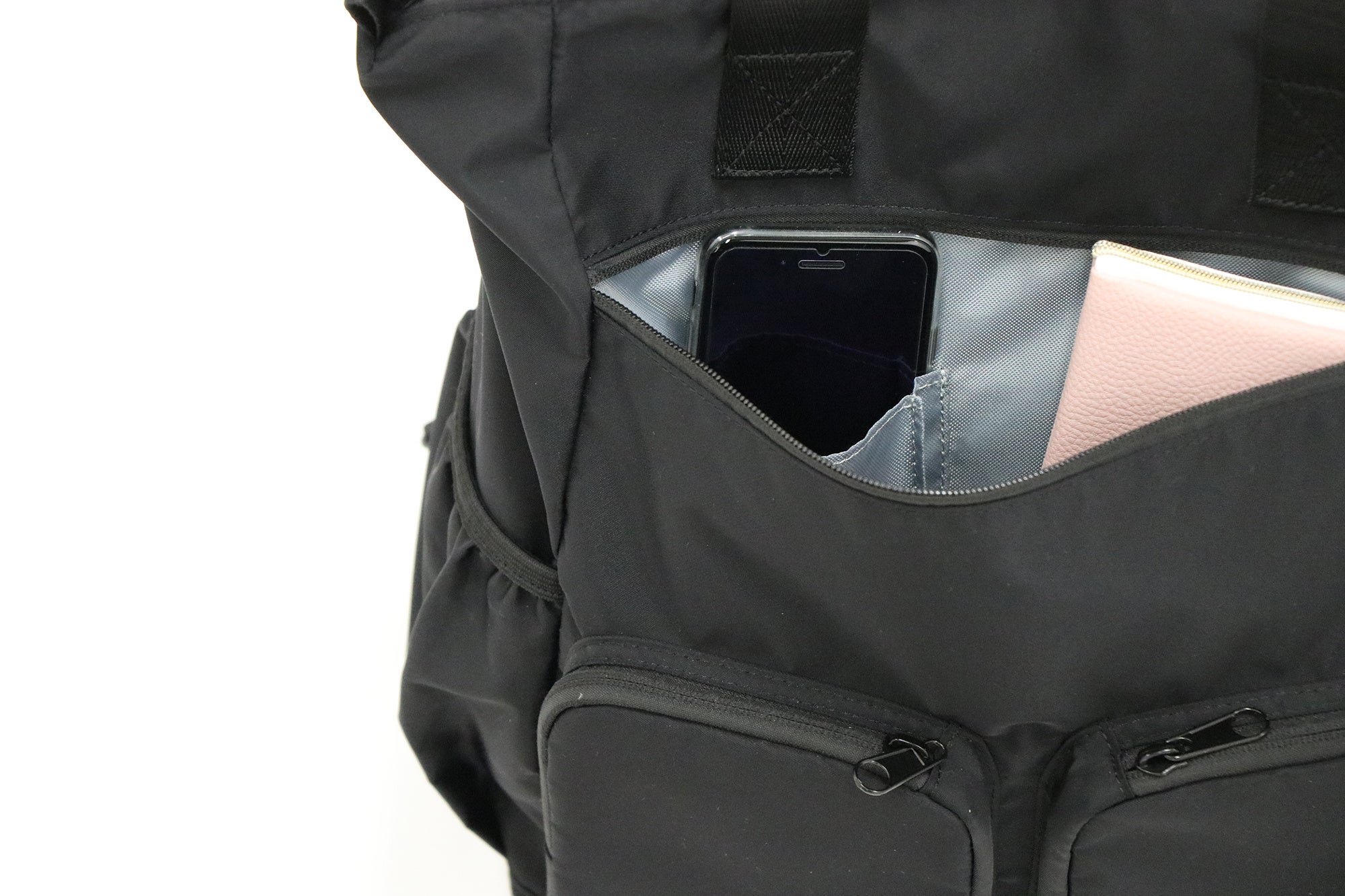 →ポケットを浅めのつくりにすることで、鍵やスマホなどを取りやすくしています。またファスナーつきポケットはサイドまで開き、手を入れやすくしています。