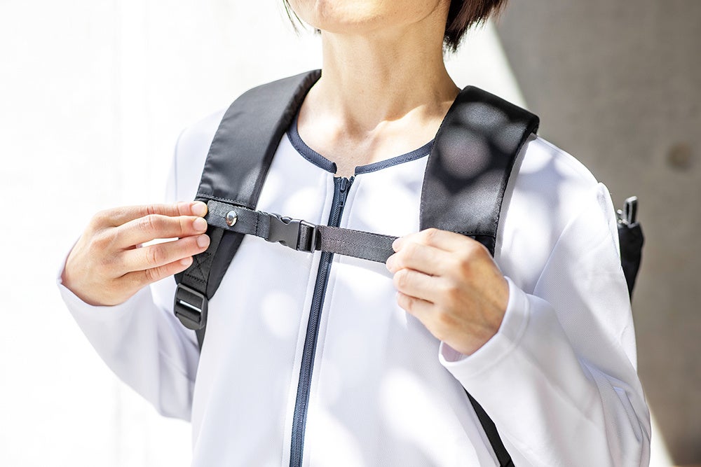 →位置が調整できるチェストストラップで体の負担を軽減。軽く感じられます。