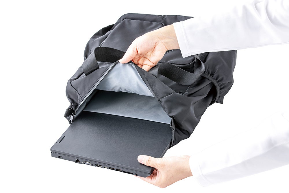 →背面にタブレットやPC用の専用ポケットを配置。15.6インチまで対応することができます。