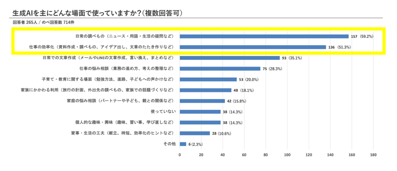 さらに、生成AIの利用場面については、「日常の調べもの」(59.2%)、「仕事の効率化」(51.3%)が上位を占め、「日常での文章作成」(35.1%)、「仕事の悩み相談」(28.3%)と続きました。一方で「子育て・教育に関する場面」での活用は20.0%にとどまっており、家庭内での子どもへの活用はまだ限定的であることがうかがえます。用途の広がりには個人差があり、家庭ごとの活用状況にばらつきがある実態が見えてきました。