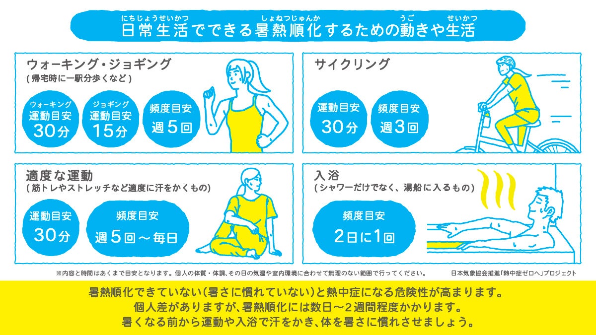 本格的に暑くなる前から、バランスの良い食事や十分な睡眠をとるなど、暑さに負けない体づくりを心がけてください。早めに、適度な運動や入浴など、暑熱順化のための動きや活動を始めて、暑さに備えましょう。