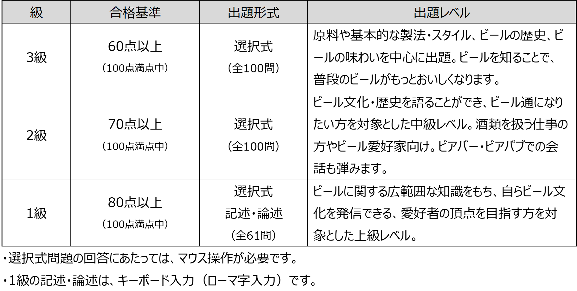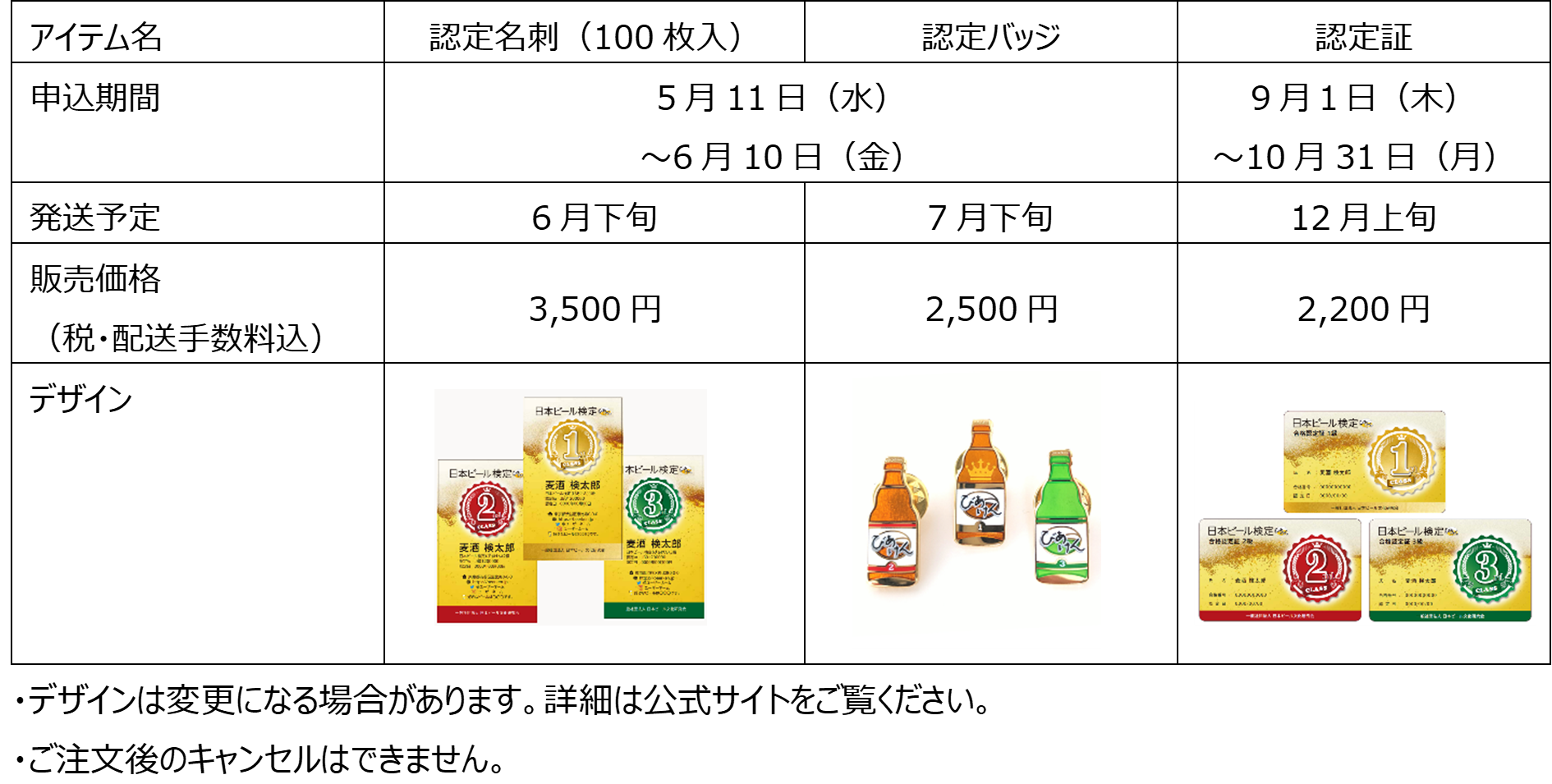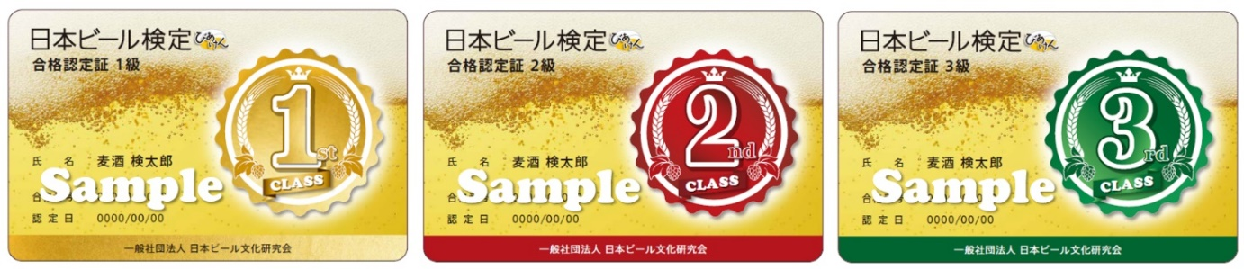 合格者には後日(受験日の約1〜2か月後に)、合格認定証(カード型)を進呈します。デザインは躍動的なビールの液体を背景に、ビールの王冠をイメージした級別のエンブレムを配置しています。