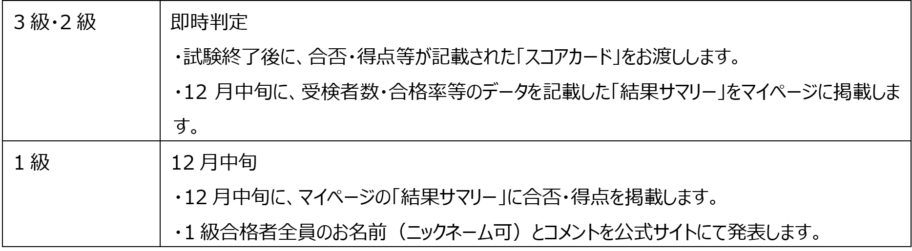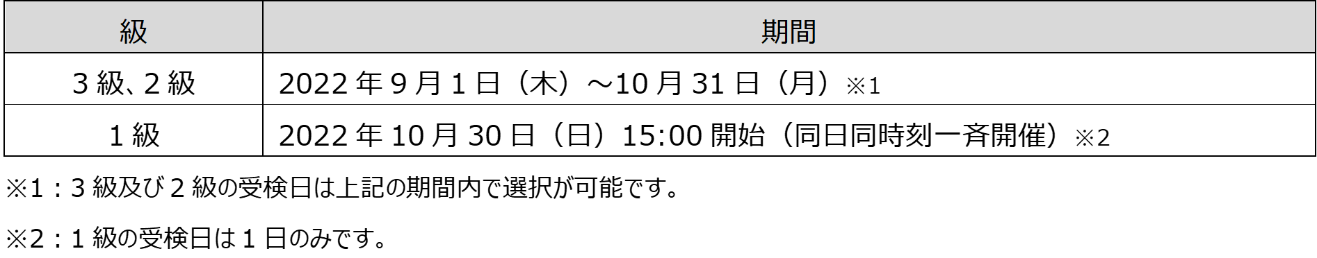 ・1級は“同日同時刻一斉開催“で、全受検者に同じ問題を出題します。問題及び回答は受検日翌日の10月31日(月)に、公式サイトの1級受検者専用ページで限定公開します。