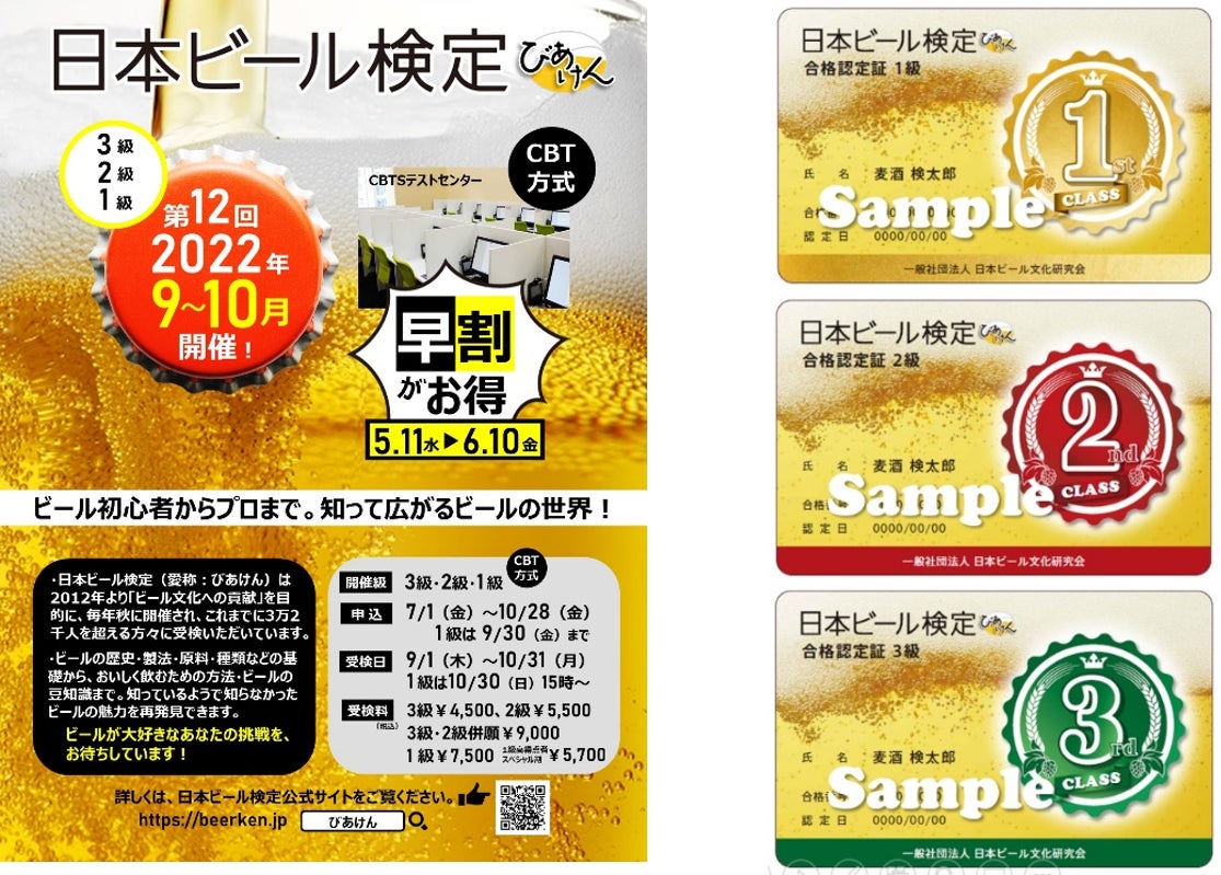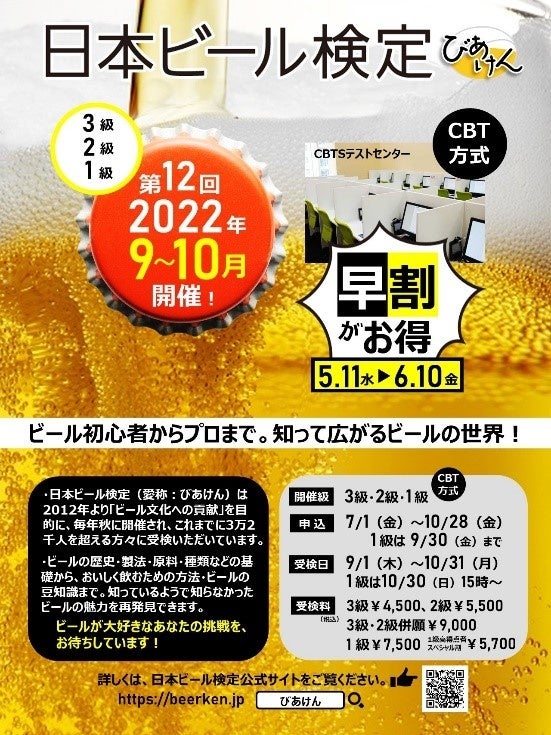 一般社団法人 日本ビール文化研究会(所在地:東京都渋谷区、代表理事:菅 敏浩)は、本年9月から2か月間に渡り開催する第12回「日本ビール検定」(愛称:びあけん)の実施概要を決定しました。今回も感染症対策及び受検者の利便性の観点から、CBT方式※(コンピュータ試験方式)で開催します。本方式では、株式会社シー・ビー・ティ・ソリューションズが運営する、全国47都道府県に約300か所あるテストセンターでコンピュータを使用して検定を行います。また、今回は試験期間を前回の3週間から2か月に拡大します。受検の日程や会場を受検者の都合に合わせて選択できるという利便性をさらに高め、より多くの方に気軽に受検の機会を提供したいと考えています。受検の申し込みは7月1日よりインターネットで開始しますが、今回は申し込みに先立ち、5月11日から1か月間、各級の受検料がお得になる「早割クーポン」を販売します。また、『日本ビール検定 公式テキスト』を2年ぶりに改訂し、5月24日に発売します。