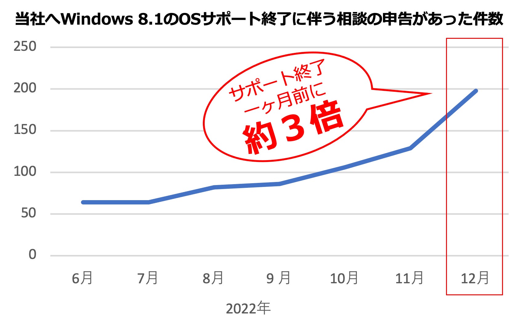 2020年1月のWindows 7サポート終了時や、2023年1月のWindow 8.1のサポート終了時には、当社にはOSのサポート終了の直前になり、「サポート終了を知らず、何をする必要があるのかわからない」「買い替える必要があるのか相談したい」「通知が来たのでアップグレードしたら失敗した」等の相談が急増しました。お悩みが多く寄せられるサポート終了直前に備えて、緊急性が高くなると予想される相談に対応できる体制を今回の業務提携により構築します。