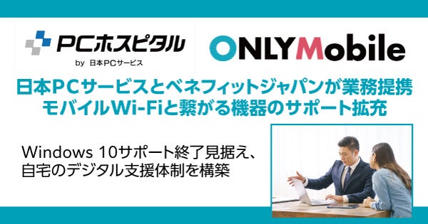 デジタル機器の設定・トラブル解決を行う日本PCサービス株式会社(本社:大阪府吹田市、代表取締役社長:家喜 信行、証券コード:6025、以下「当社」)は、株式会社ベネフィットジャパン(本社:大阪府大阪市、代表取締役社長:佐久間 寛、以下:「ベネフィットジャパン」)と2025年2月10日(月)に業務提携したことを報告します。ベネフィットジャパンが展開するモバイルWi-Fiサービス「ONLY Mobile」ユーザー向けのデジタルサポートを開始します。「ONLY Mobile」ユーザーは高齢者も多いため、Windows 10のサポート終了も控える中、サポート面を充実させて顧客満足度の向上を目指します。