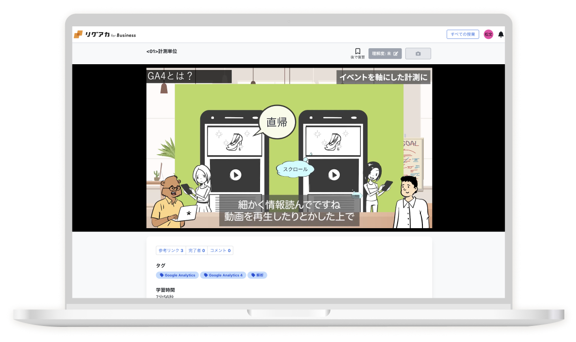 また、管理画面機能も用意しており、受講者の進捗状況や理解度を詳しく見ることもできます。