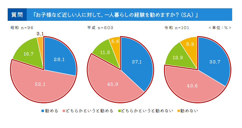 勧めると答えた人は合計で約8割と、全体的に最初の一人暮らしの満足度は高かったことが分かりました。