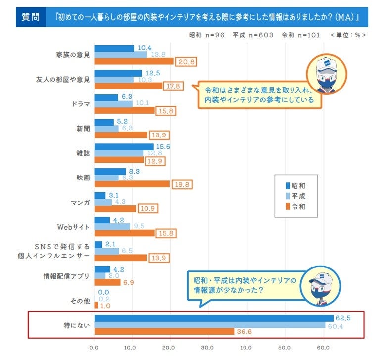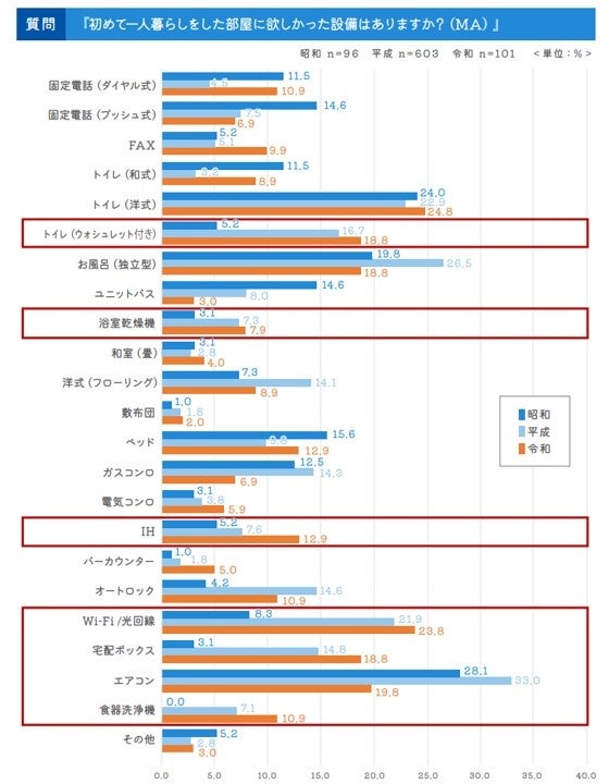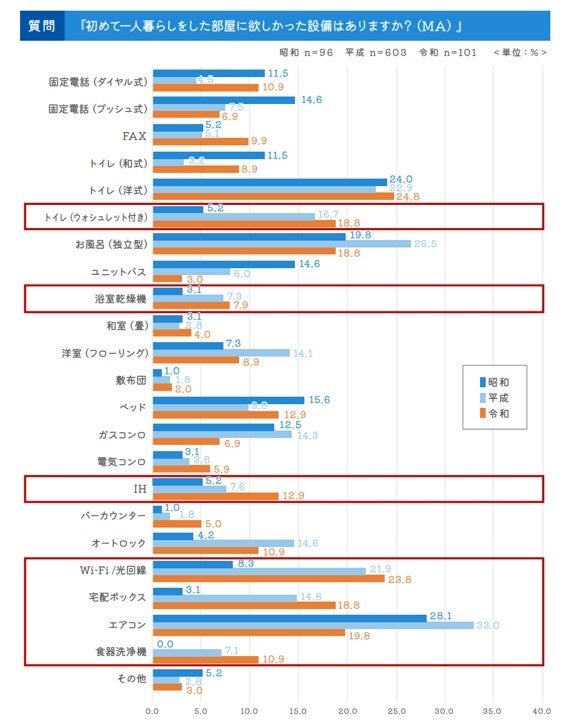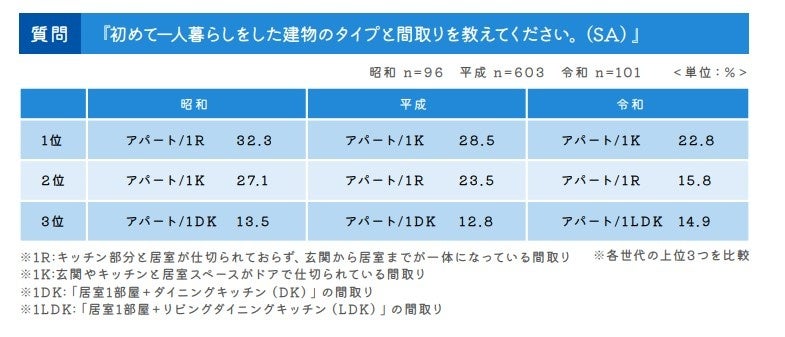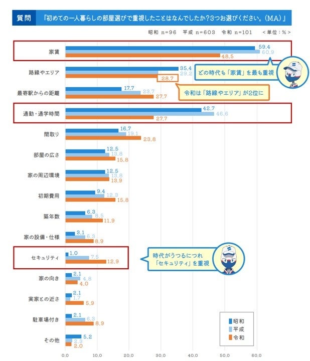 なお令和は「セキュリティ」を選んだ人が昭和・平成よりも多く、他の時代の一人暮らしよりも安全性を重視し