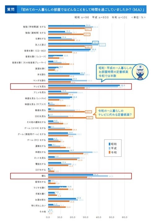 昭和・平成の一人暮らしの部屋の主な過ごし方は「テレビを見る」。令和の「テレビを見る」は半数に