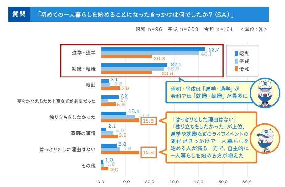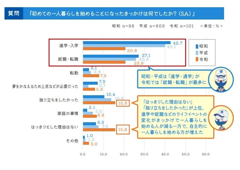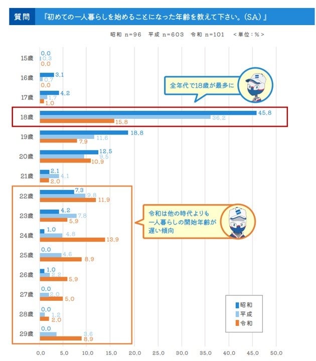 令和は社会人になってから、昭和・平成は大学等への進学時に一人暮らしを始める人が多い傾向