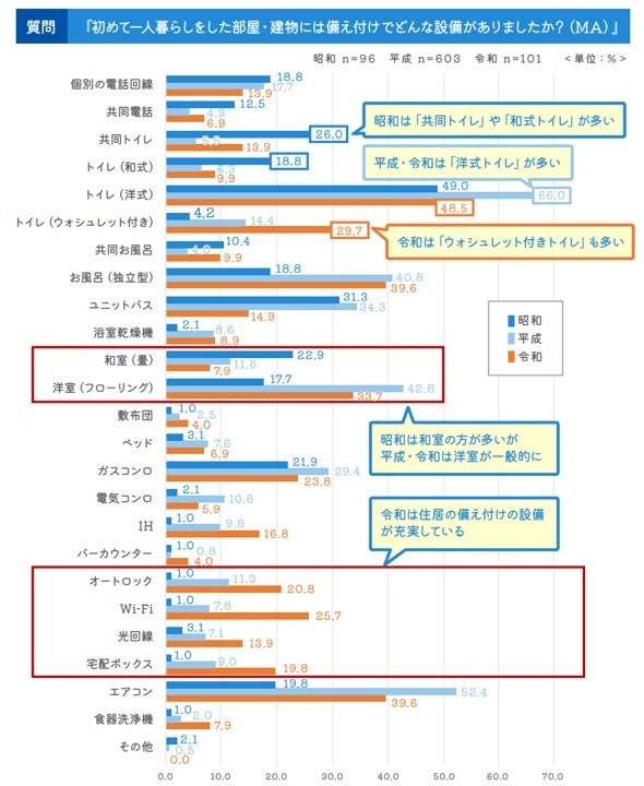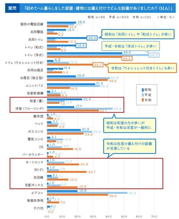 初めての一人暮らしの部屋の設備を聞いたところ、「昭和は和室(畳)」の部屋が多かったのに対し、平成・令