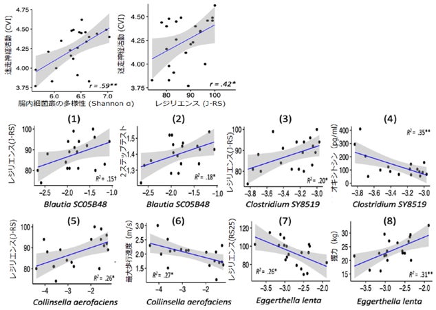 その結果、 27 名中 13 名( 40.74 %)の母親の身体運動機能は、筋骨格筋量がサルコペニアの医学的診断基準値よりも低い状態にありました(図3)。握力、歩幅、歩行速度についても、大半の参加者が同年齢女性で示されている基準値よりも低く、産後半年が経過した時点でも筋肉量や運動機能が低い状態にあることが分かりました。さらに、迷走神経活動は、心的レジリエンスと腸内細菌叢の多様性の両方と関連していました。腸内細菌叢の中でも、Blautia SC05B48 、Clostridium SY8519、Collinsella aerofaciens、Eggerthella lentaは、心的レジリエンスや身体運動機能、オキシトシンと関連していました(図4)。これらの結果は、酪酸の産生や抗炎症に関連する菌や女性ホルモン様作用を持つエクオールの産生に関連する菌が、母親の心身のレジリエンスに関連する可能性を示しています。