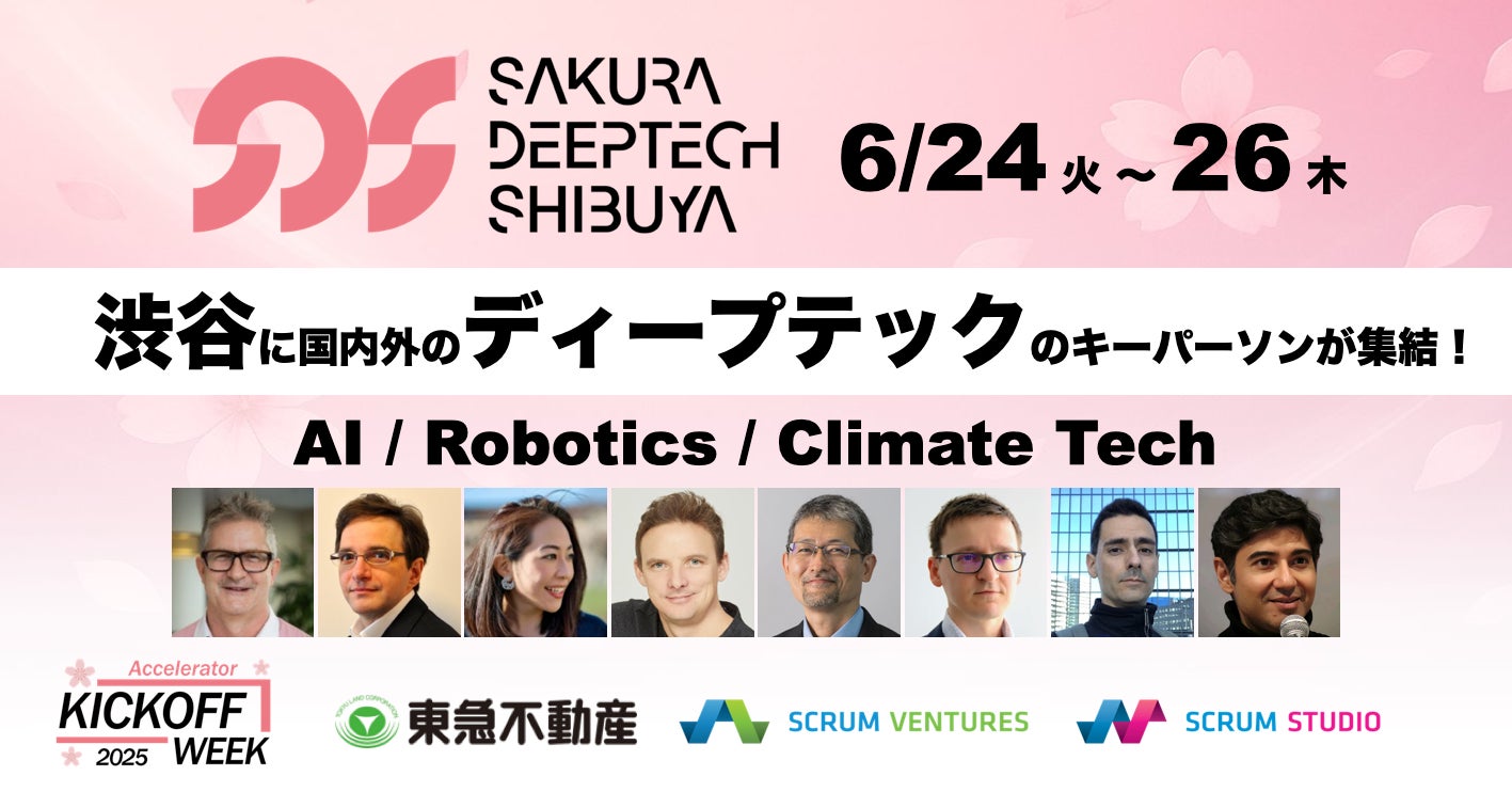 スクラムベンチャーズ・スクラムスタジオ株式会社は、東急不動産が渋谷サクラステージにて開発を手がけた日本最大級のディープテックコミュニティ「SDS」において、Sakura Deeptech Shibuya AcceleratorのKickoff Weekを開催します。期間中の6/24, 25, 26には一般の方も参加できるOpen Sessionを開催します。国内外のディープテック関連のキーパーソンが集まる非常に貴重な機会です。参加費は無料。Climate Tech、AI、Robotics分野での事業展開や投資を検討されている方、最新の動向に関心のある方は、ぜひご参加ください。全セッションに同時通訳(画面投影)があります。