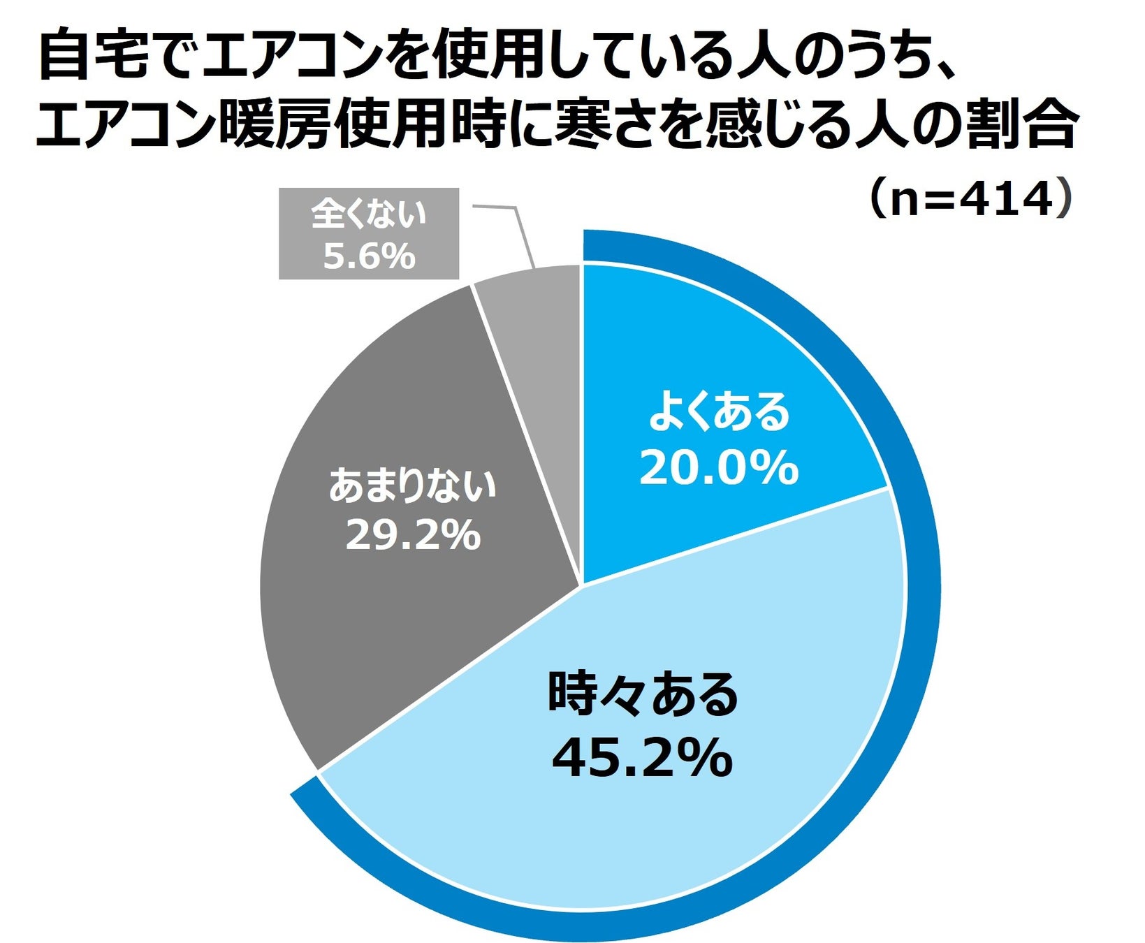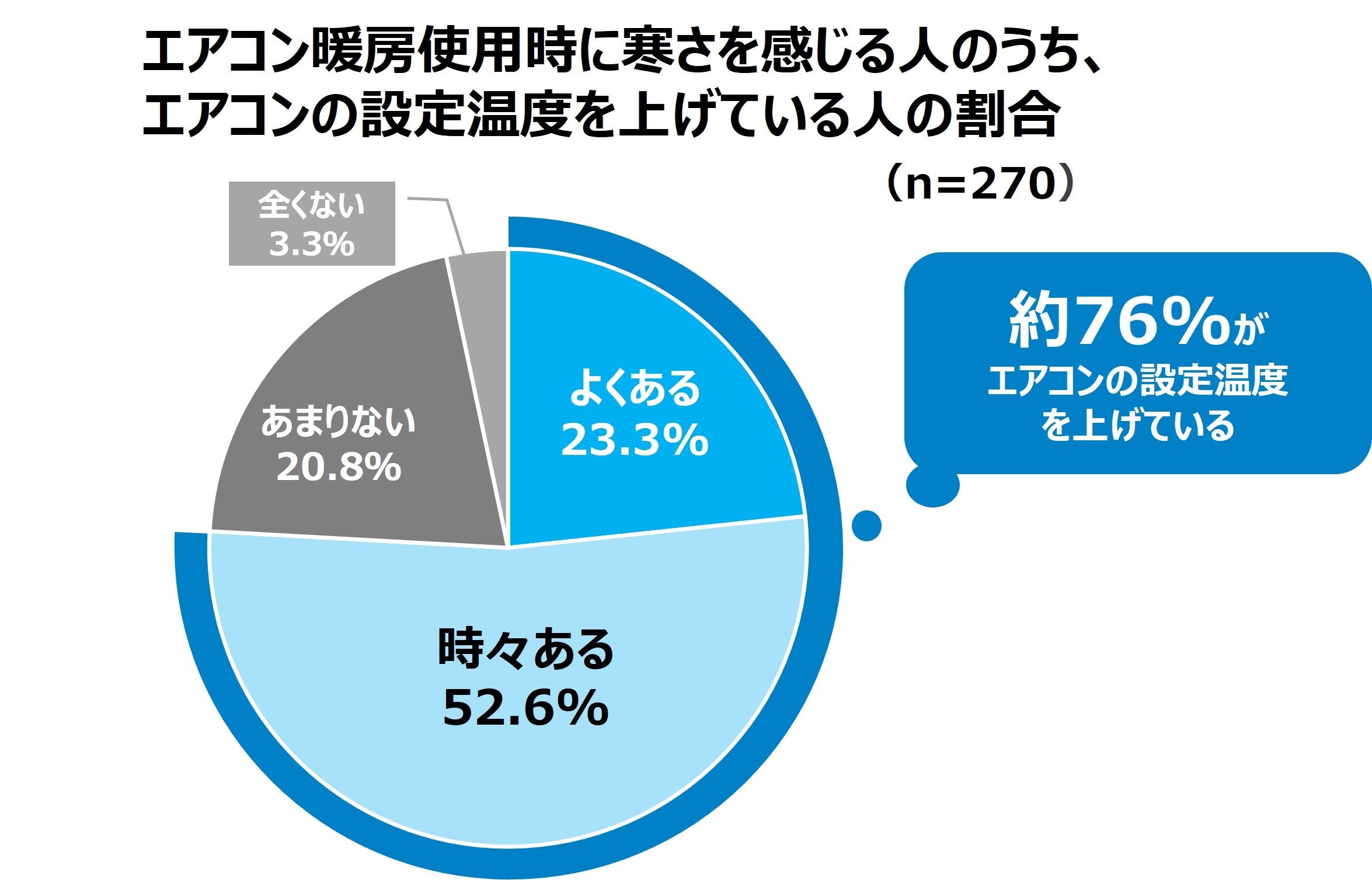 今回の調査では、冬にエアコンを使用している人の約65%の人がエアコン運転時にも寒さを感じており、そのうちの約76%は、肌寒くなるとエアコンの設定温度を上げていることが分かりました。