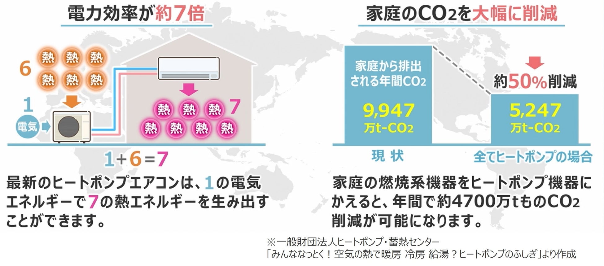 また、ヒートポンプは空気を暖めるだけでなく、水を温めてお湯にすることもできます。日本では、この原理を利用したヒートポンプ給湯機「エコキュート」が、お風呂やシャワーなどの給湯に利用されています。家庭の空調や給湯で使用されているガスや石油などを使う燃焼系機器をヒートポンプ機器にかえると、家庭のCO2排出量は約半分になるともいわれています。