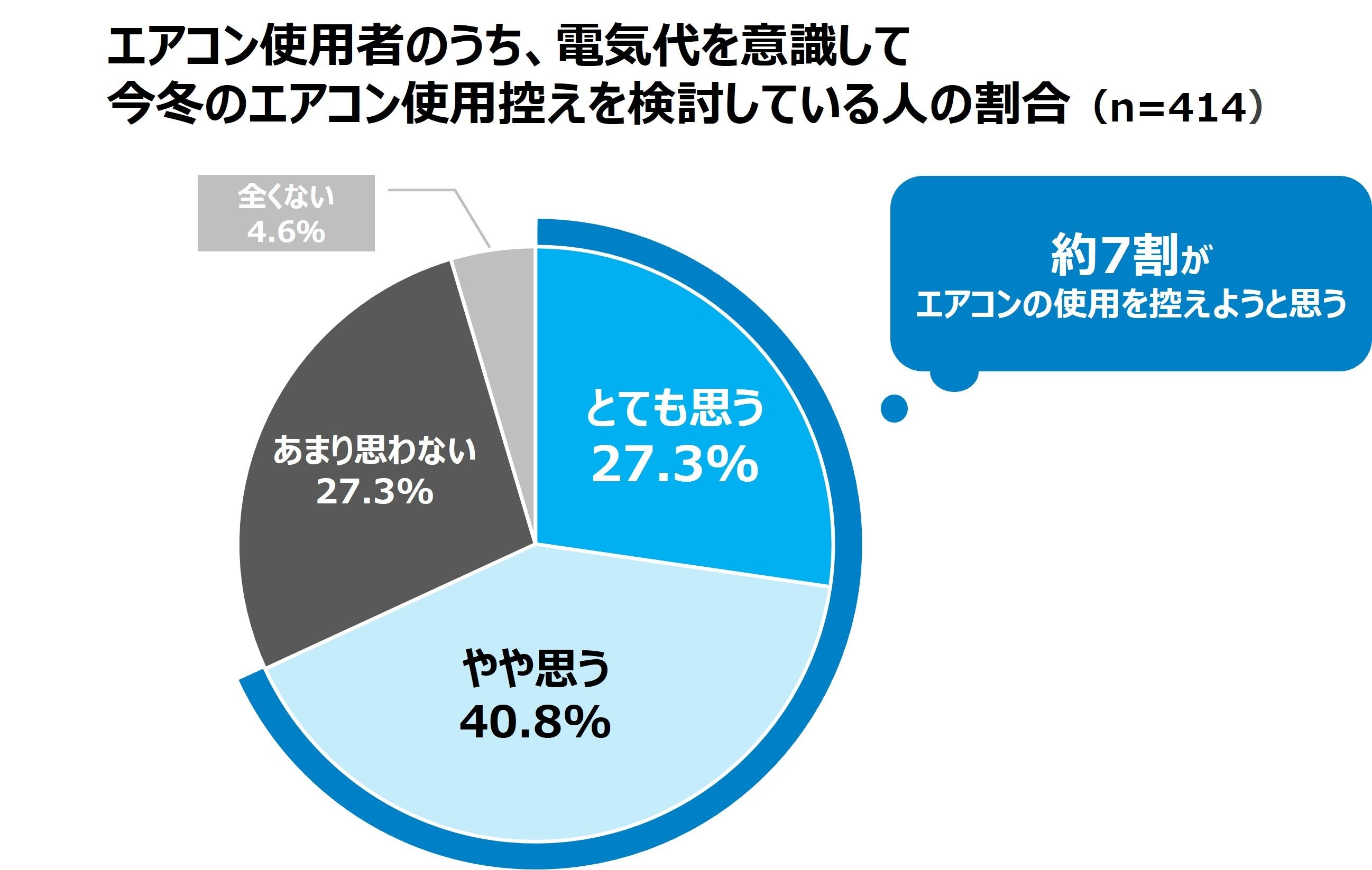 家計への電気代の影響が大きくなる冬、エアコンの節電に取り組んでいる人は半数以下電気代に無駄があるかもしれないエアコン使用者は7割以上