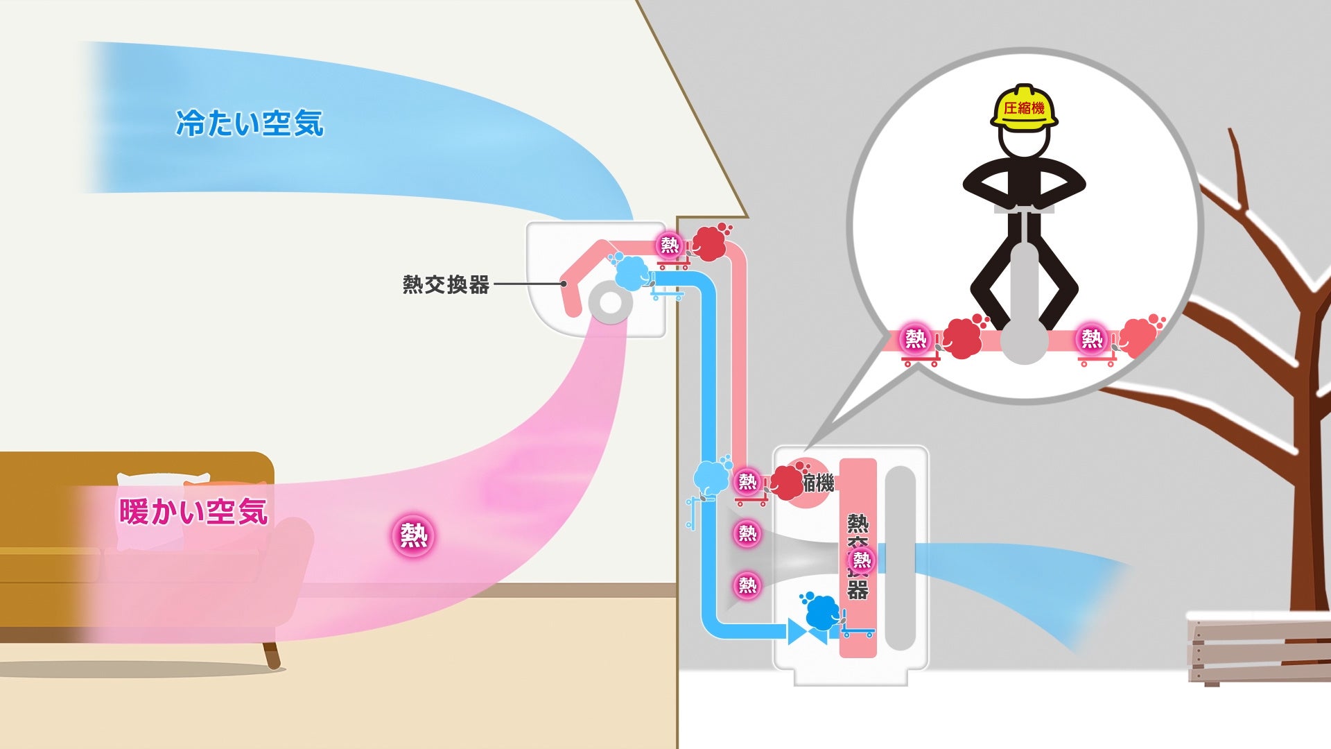 冬、部屋が「寒い」と感じるのは空気中の「熱」が少ないからです。この熱を増やして部屋を暖かくするのがエアコンです。エアコンは、「室内機」と「室外機」がパイプ(配管)でつながっていて、暖房時には屋外の「熱」を室内に移動させて部屋を暖かくしています。