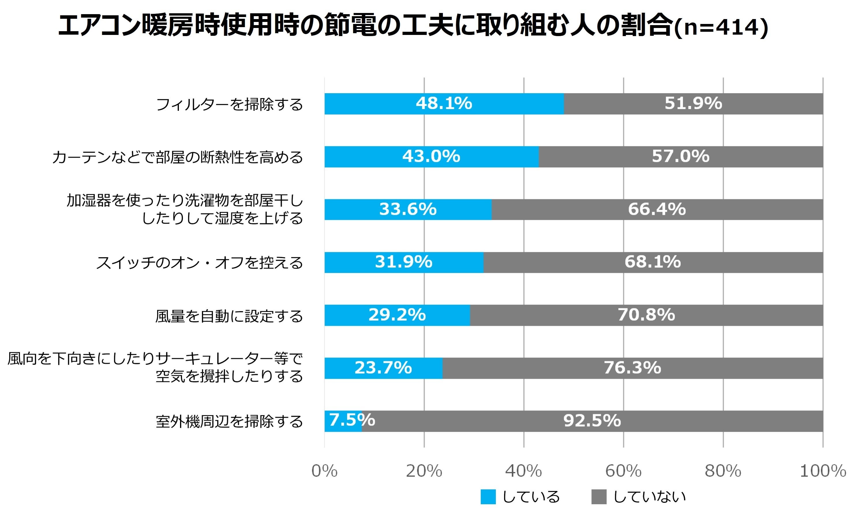 また、全体の半数以上が、エアコンのフィルター掃除や室外機周辺の整理整頓など、エアコンの基本的な節電に取り組んでいないことも明らかとなりました。今回の調査では、加湿や空気の攪拌など「設定温度を上げる前にできる節電の工夫」だけでなく、「エアコンの基本的な節電方法」を知らない人が多い可能性もうかがえる結果となりました。
