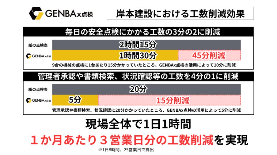 大阪府の岸本建設が、安全点検のDX化を加速する「GENBAx点検」を活用して点検業務の工数を3分の2に!承認作業や書類検索などの負担も軽減し1ヶ月あたり3営業日分の工数削減に成功!