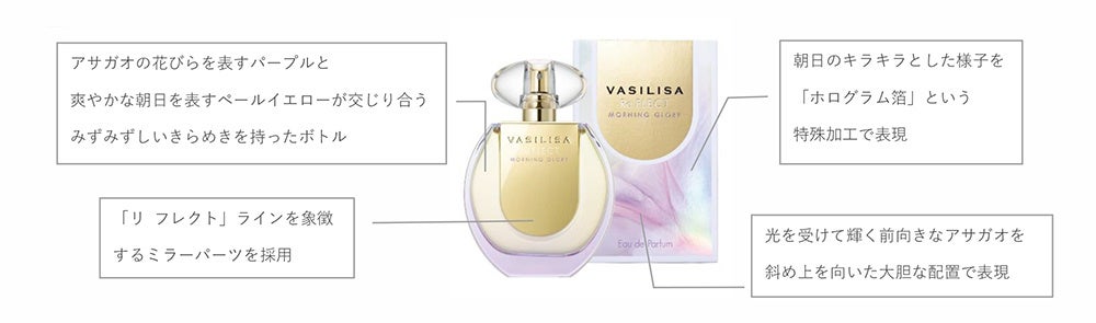 香りのテーマは「朝露がきらめく晴れやかなアサガオ」。夏の清々しい朝、朝日を受けて輝くアサガオに自身を投影し、内なるきらめきを見つめなおす、そんな情景をイメージしています。香りは単なるフローラル調ではなく、トップノートにレモンを調香し、朝日が差し込んできたキラキラとした様子を表現。また、ラストノートにはサンダルウッドを加え、花のやわらかい香りへと移行していきます。ボトルデザインには、アサガオの花びらをイメージしたパープルを基調に、みずみずしいきらめきを反映しました。アサガオの夏の輝きを、香りとデザインでお楽しみください。