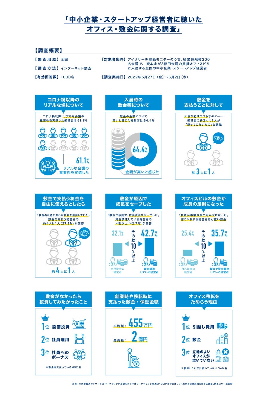 資金調達を行なった中小・スタートアップ企業の経営者のうち45.6%が「敷金がなければ成長できた」と回答しました。また、敷金が原因で「成長への投資をセーブした」との回答が42.7% 、敷金がなかったら「設備投資・社員雇用・社員へのボーナスに投資してみたかった」などの回答結果が発表されました。