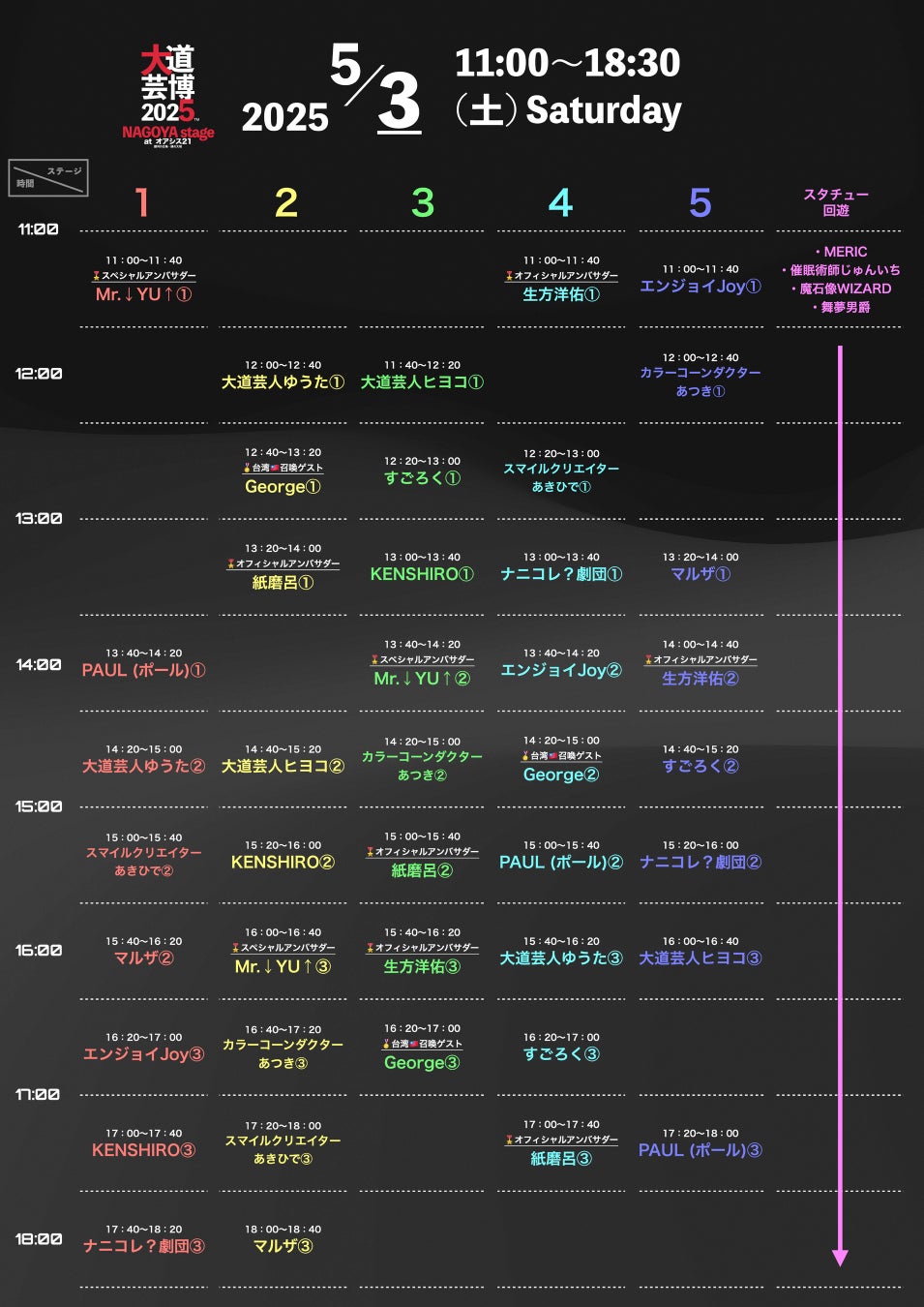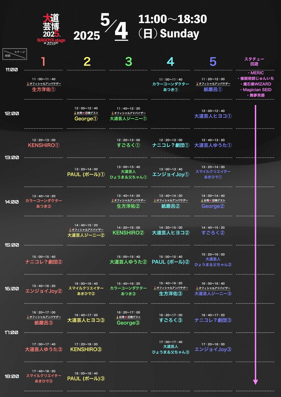 【出演順】①ROCKS ②大道芸人ジーニー ③Mr.↓YU↑ ④台湾🇹🇼召喚ゲスト/ジョナス ⑤生方洋佑 ⑥健山 ※予定