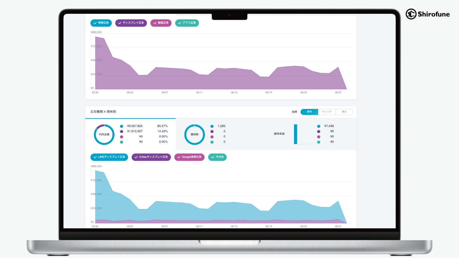 連携する全ての広告配信プラットフォーム横断のレポートデータの統合(ダッシュボード化)、運用状況の変化要因の自動分析、広告予算の自動管理がShirofune上で可能に