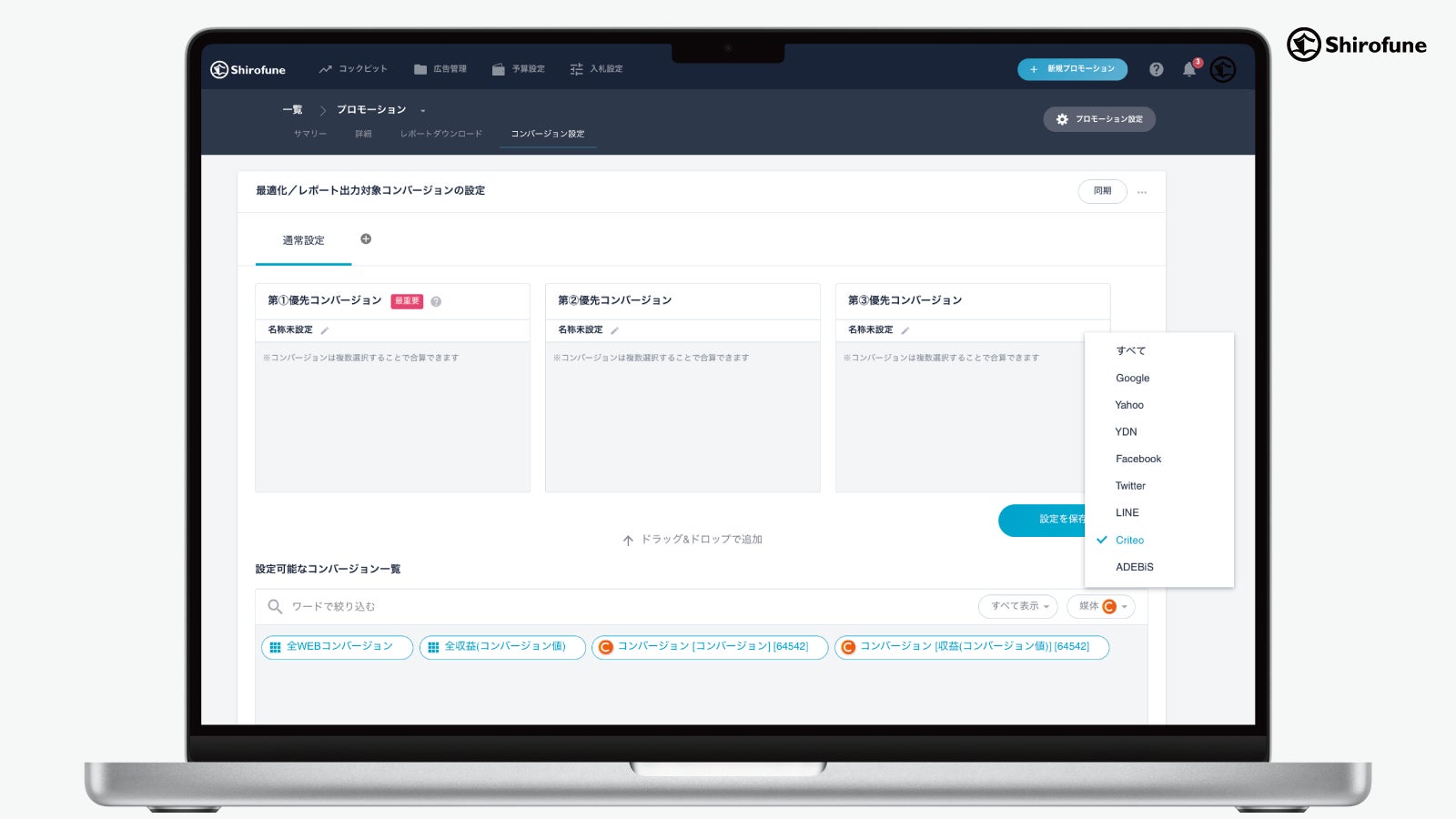 Shirofuneは、主要広告プラットフォームの運用業務の効率化・生産性向上と広告効果の最大化を同時に実現する、広告運用自動化ツールです。プロの広告運用技術を再現するシステムで日々の運用業務全般を自動化可能で、経験を問わず広告運用で成果が出せます。